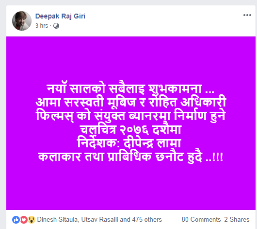 निर्देशकसँगै गिरीले आफ्नो पोस्टमा सिनेमाको रिलिज मिति पनि उल्लेख गरेका छन्। पोस्टका अनुसार सिनेमा २०७६ को दशैंमा रिलिज हुनेछ।