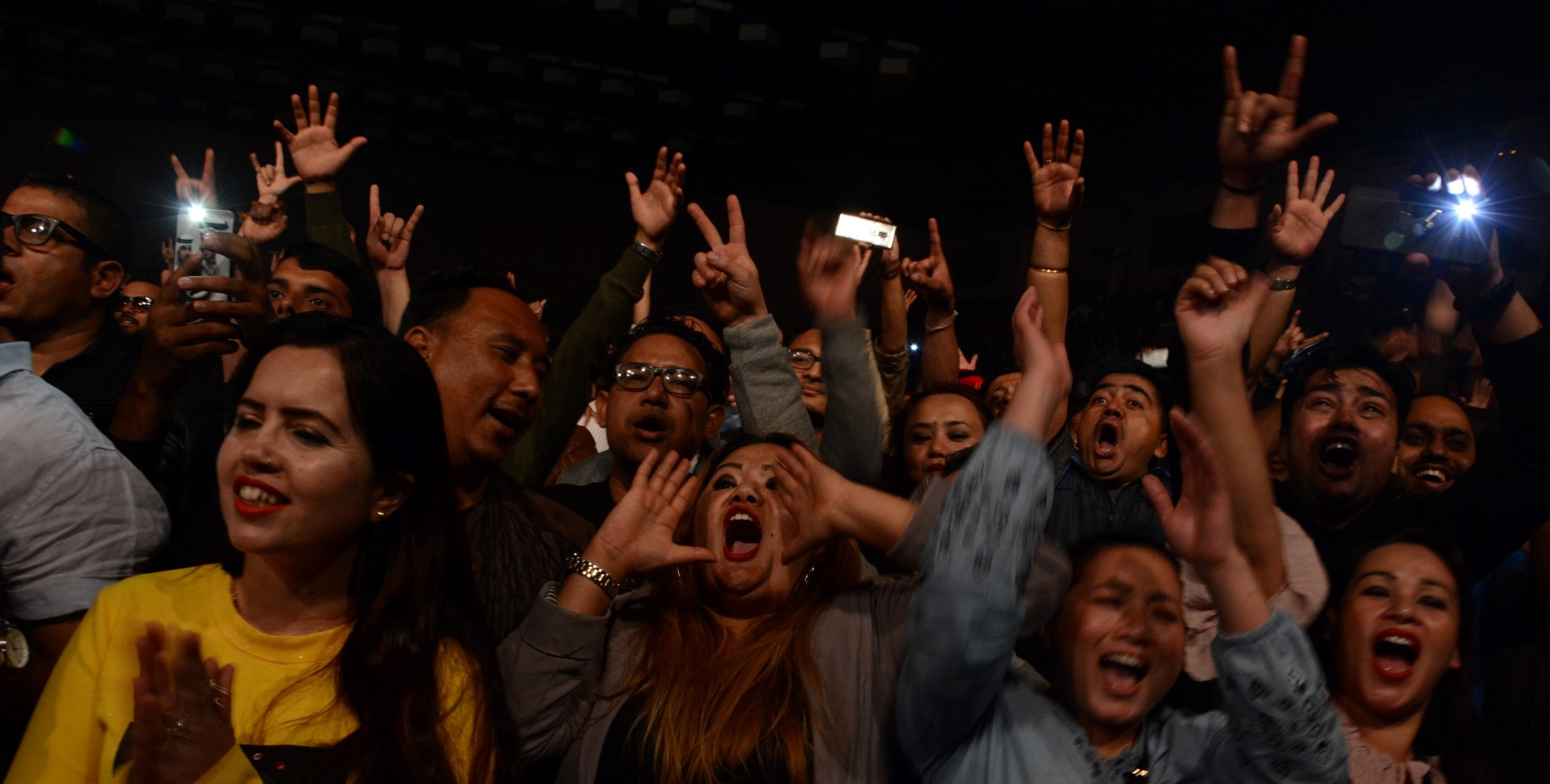 जवाफमा २५ सय दर्शकले भरिएको हल गुञ्जिने गरी सबैले चिच्याएरै जवाफ दिइरहेका थिए–