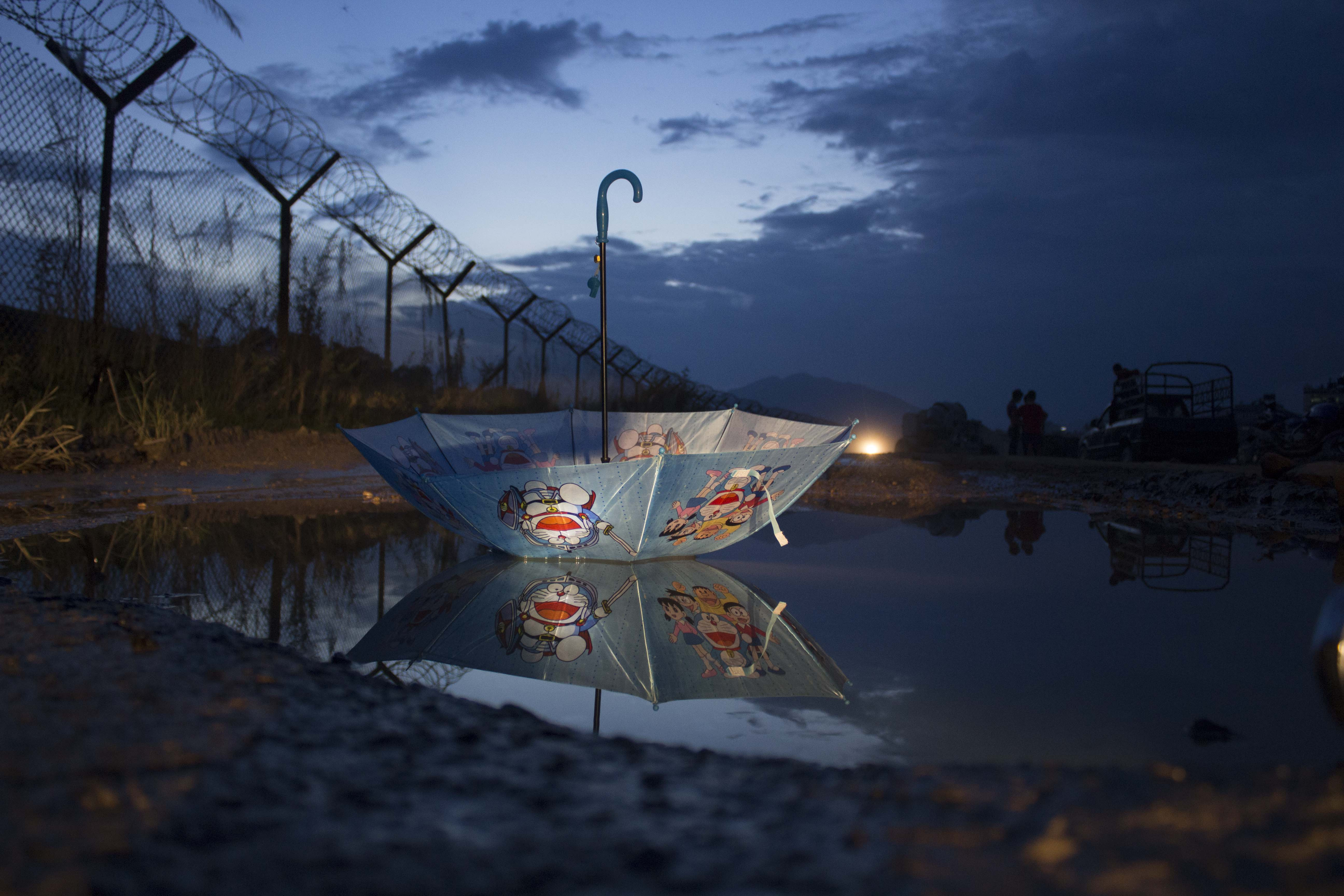 छोरी छाता र पानीसँग खेल्न थालिन्।