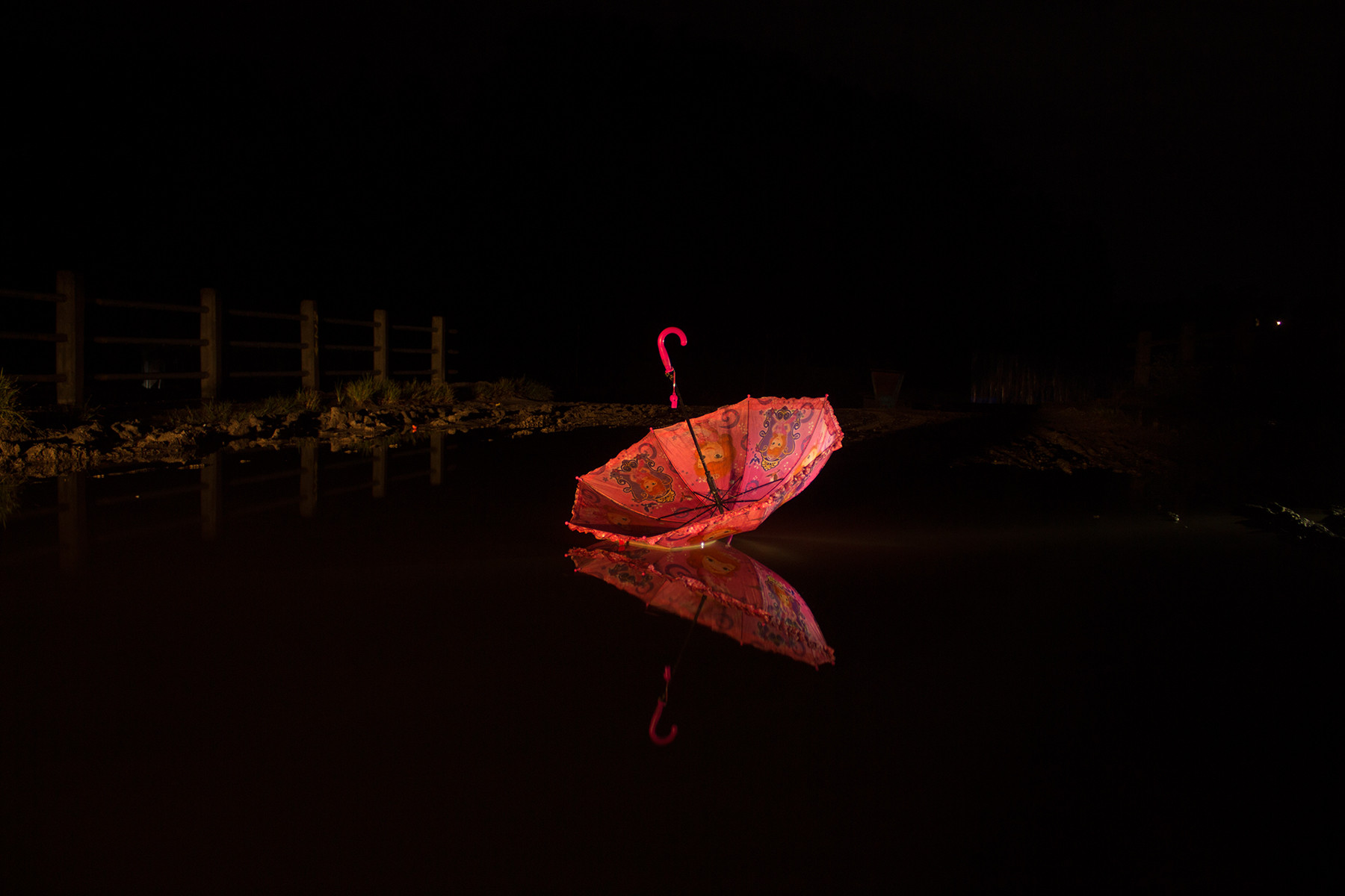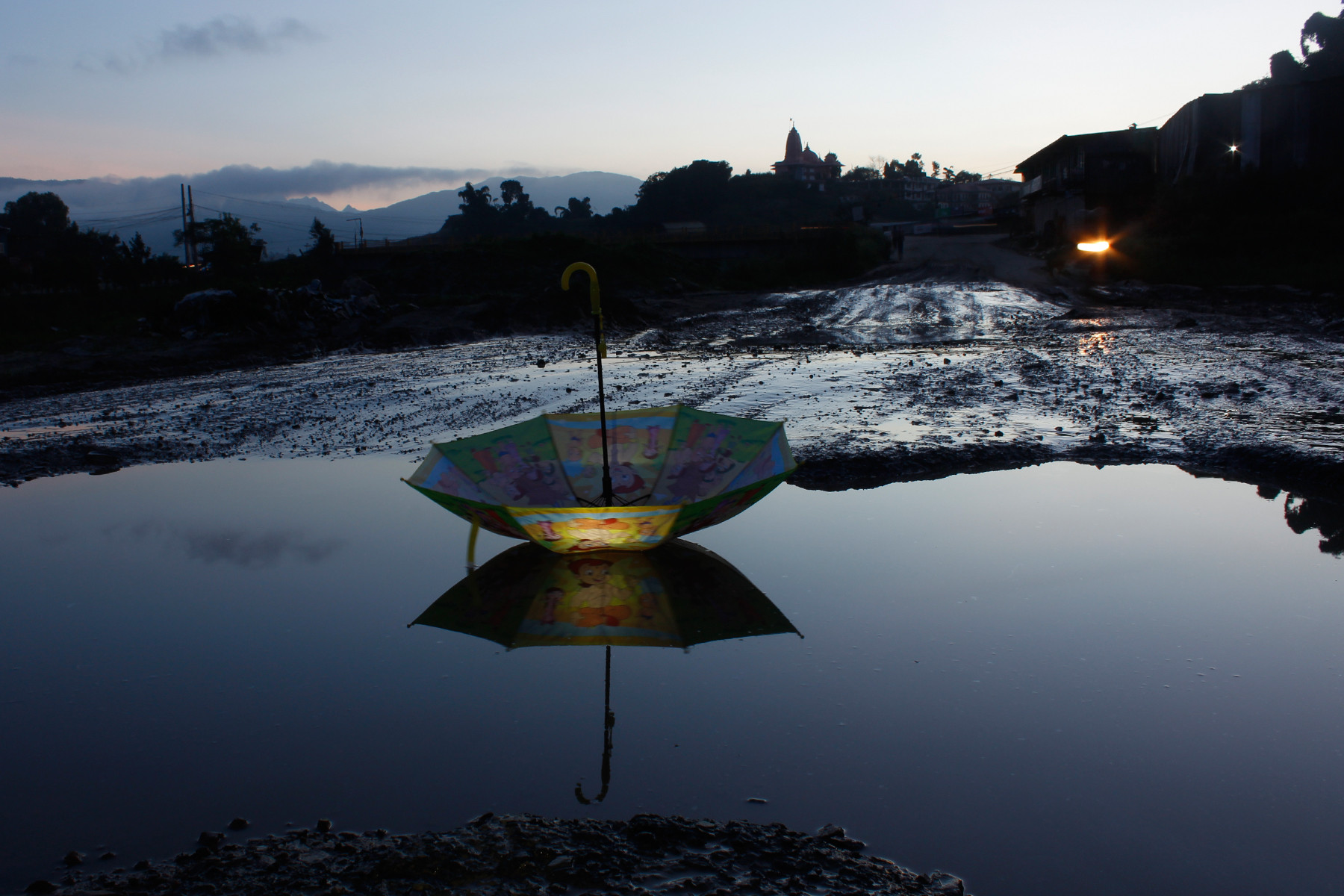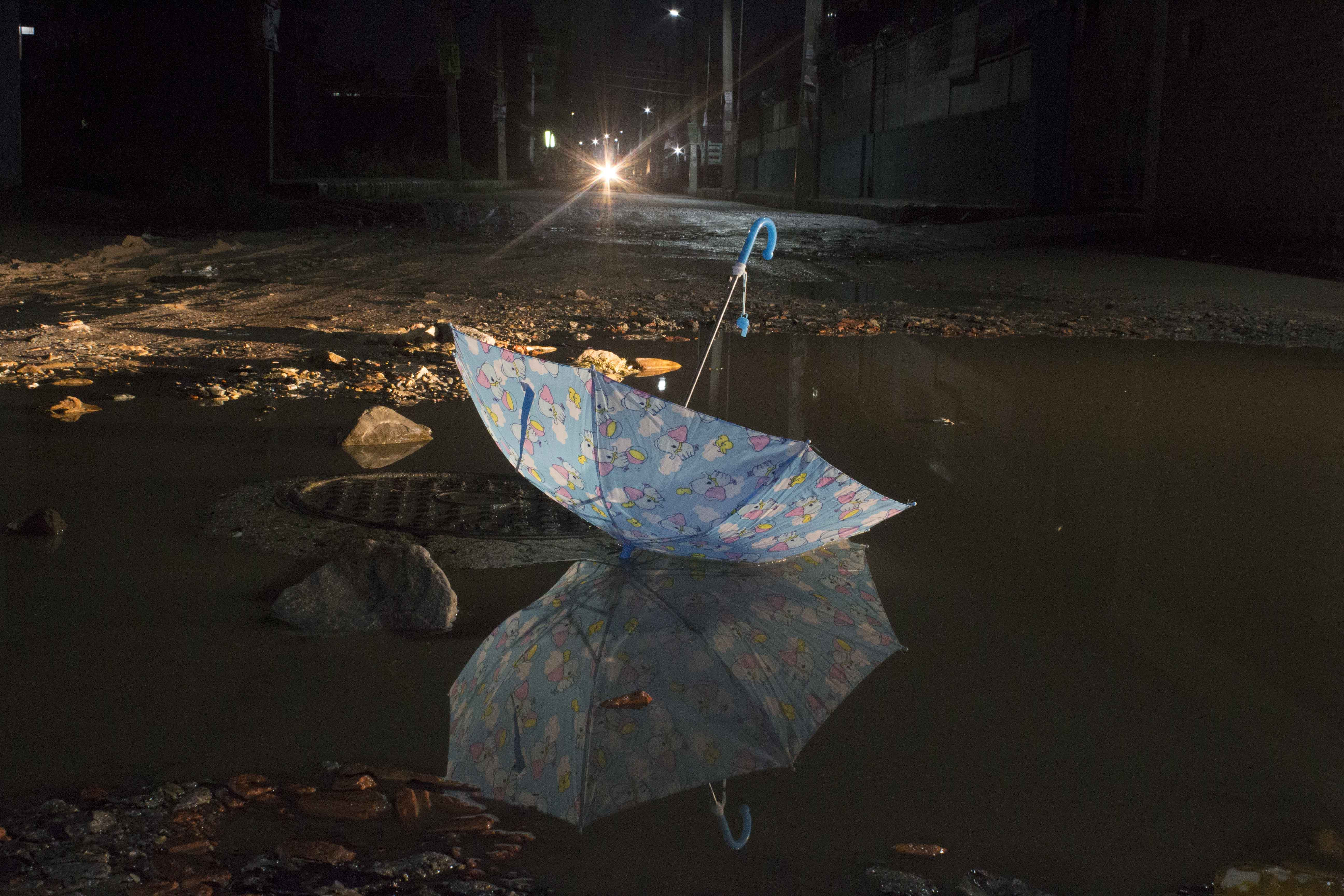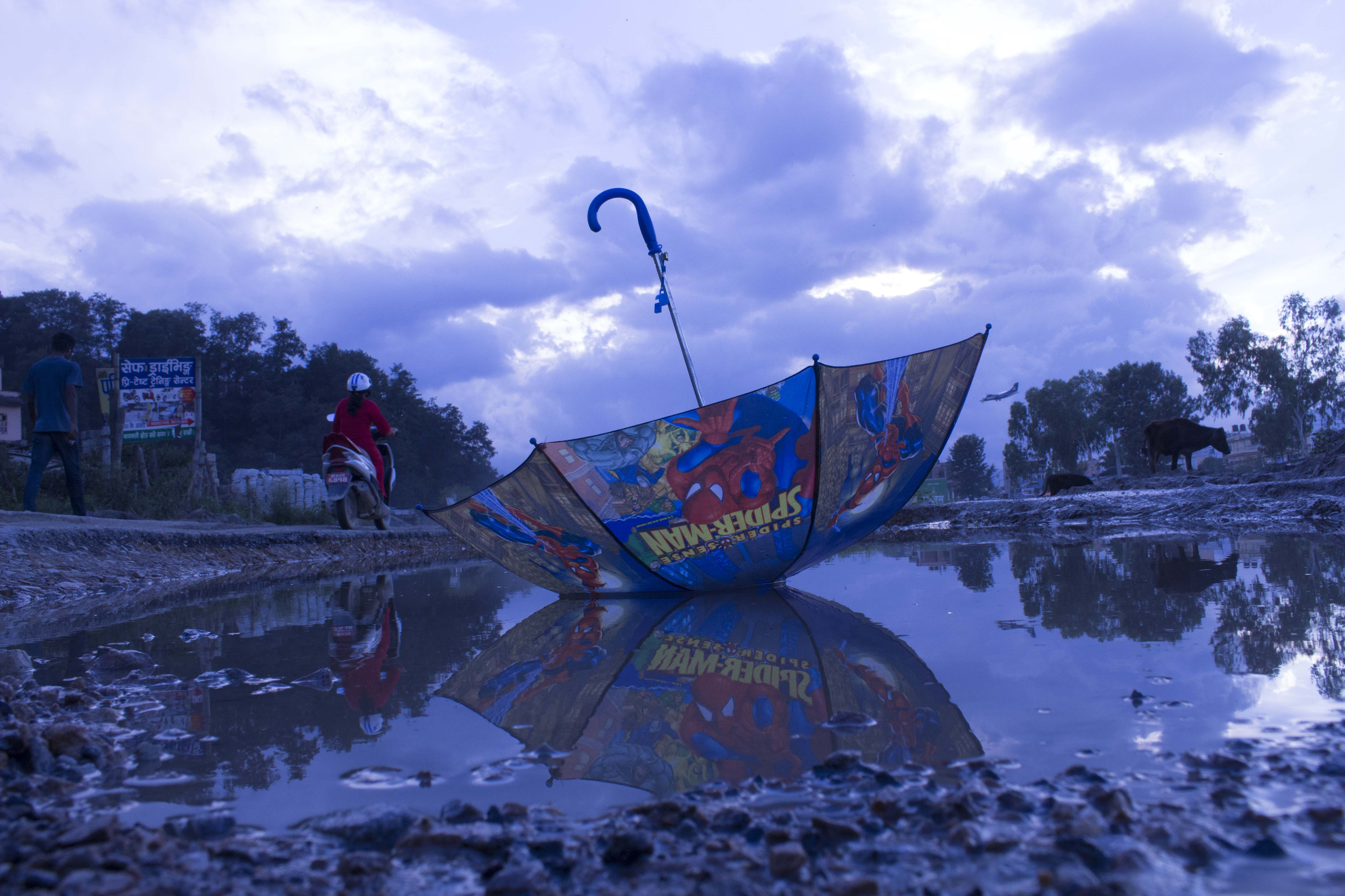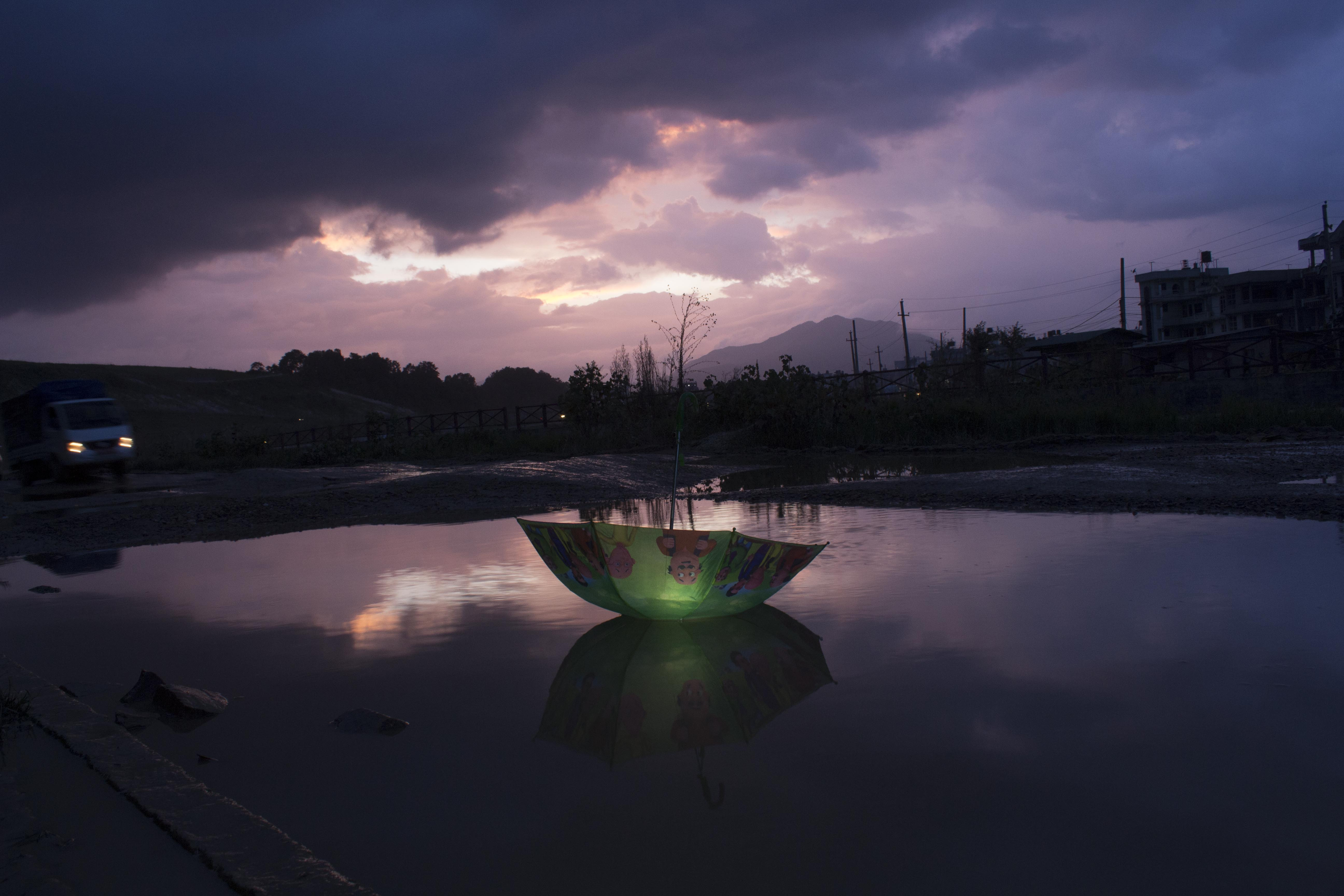 त्यहीँबाट मैले यो प्रतिस्थापन कलाबारे परिकल्पना गरे। नेपाल राष्ट्रिय कला प्रदर्शनीमा ‘मेमोरी अफ माई कन्ट्री’ शीर्षकमा प्रदर्शनरत यी फोटामा मैले विशेषगरी बच्चाका छाता र यहाँका खाल्डालाई प्रतीक रुपमा प्रस्तुत गरेको छु। यी छातामा भएका विभिन्न कार्टुनले बाल्यकालको स्मरण गराउँछ। त्यस्तै यहाँका खाल्डाखुल्डीले देशको अवस्था दर्शाउँछ।