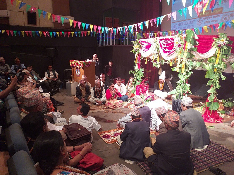 राष्ट्रिय नाचघरको सभाकक्षको मञ्चमा विवाहमण्डप तयार गरिएको हुन्छ । ध्वजापताकासहित चिटिक्कको जग्गे निर्माण गरिएको छ । पञ्जेबाजा बजाउँदै दुलही लिन जन्ती आउँछन् । दुलही पक्षले जन्ती पर्सन्छ । विवाहमण्डपमा दुलहीलाई सिँगारेर ल्याइन्छ । दुलाहादुलही जग्गेमा बस्छन् । नौमती बाजाको आवाजले सभाकक्ष विवाहमय बन्छ । दुलही र दुलाहा पक्षबीच लोकगीतका माध्यमबाट सिलोक(श्लोक) जुहारी (दोहोरी) चल्छ ।