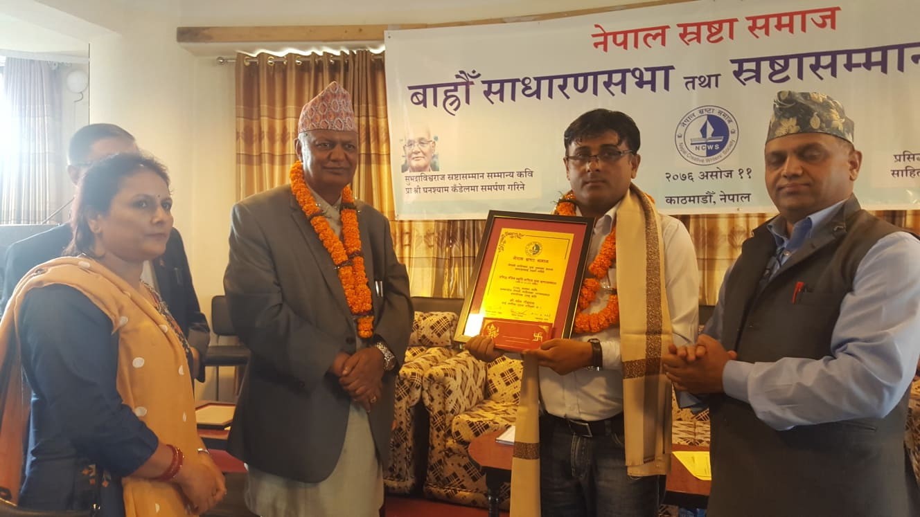 नेपाल स्रष्टा समाजले आफ्नो बाह्रौं साधारण सभाको अवसर पारेर दुई स्रष्टालाई सम्मान गरेको छ। काठमाडौंमा आयोजित एक समारोहका बीच समाजले यस वर्षको 'सुभद्रा विश्वराज स्रष्टा सम्मान'बाट घनश्याम कँडेललाई र 'प्रसिद्ध कँडेल स्मृति राष्ट्रिय युवा स्रष्टा सम्मान' बाट महेश पौडेललाई सम्मान गरेको हो।