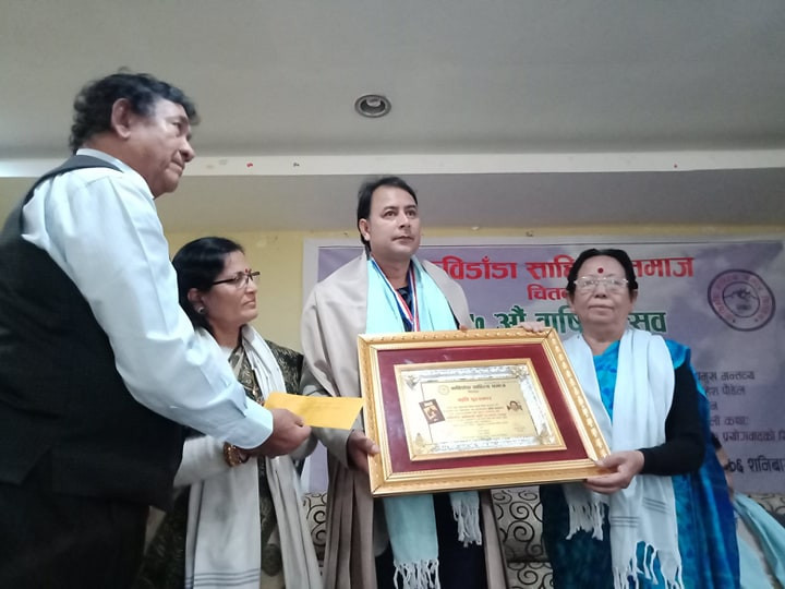 पुरस्कार ग्रहण गर्दै 'मैदारो'का लेखक भूपिन