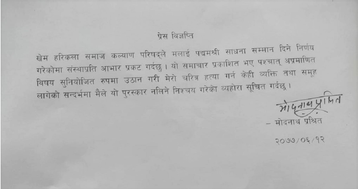 'मलाई पद्मश्री साधना सम्मान दिने निर्णय गरेकोमा संस्थाप्रति आभार प्रकट गर्दछु,' आफ्नो हस्ताक्षरसहितको विज्ञप्तिमा उनले भनेका छन्, 'पद्मश्री साधना सम्मानको सूचना सार्वजनिक भएपछि अप्रमाणित विषय सुनियोजित रुपमा उठान गरी मेरो चरित्र हत्या गर्न केही व्यक्ति तथा समूह लागेको सन्दर्भमा मैले यो पुरस्कार नलिने निश्चय गरेको व्यहोरा सूचित गर्दछु।'
