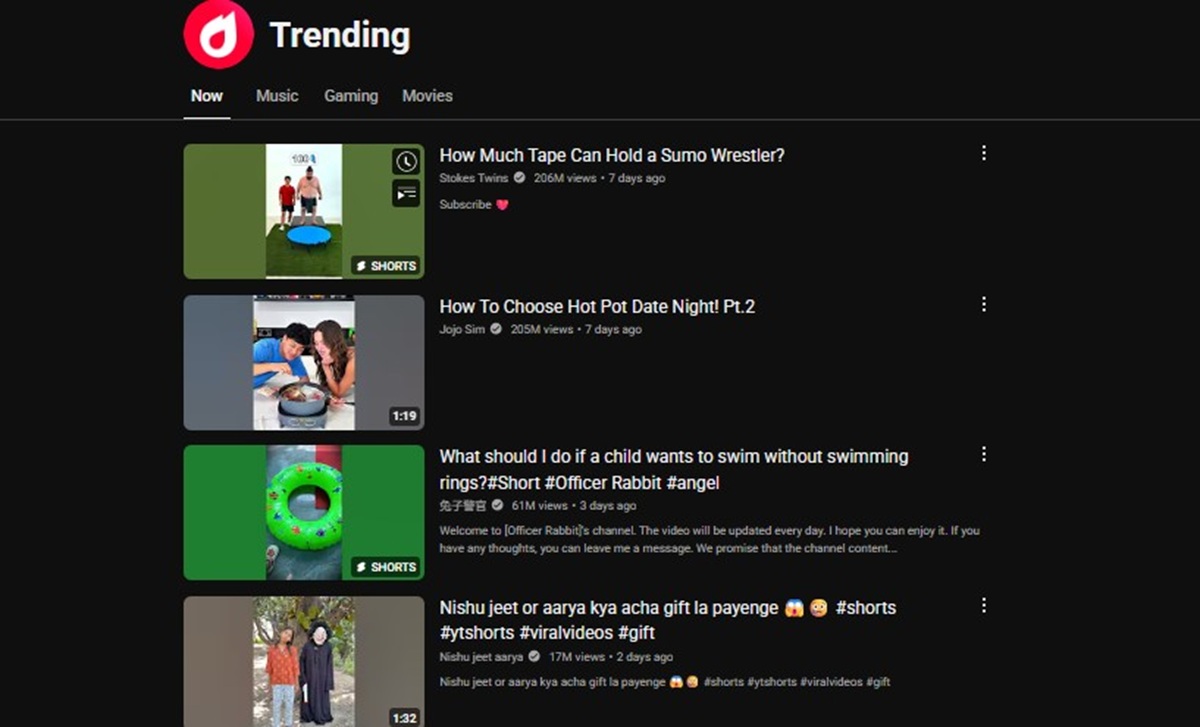 केही समय अघिसम्म युट्युब ट्रेन्डिङमा म्युजिक भिडिओ, फिल्म, फिल्मका गीत, सिरियलसँगै अन्य लामा भिडिओ प्रशस्तै देखिन्थे। पछिल्लो समय भने युट्युब ट्रेन्डिङमा 'सर्ट्स भिडिओ' (छोटा भिडिओ) को वर्चश्व देखिन थालेको छ।