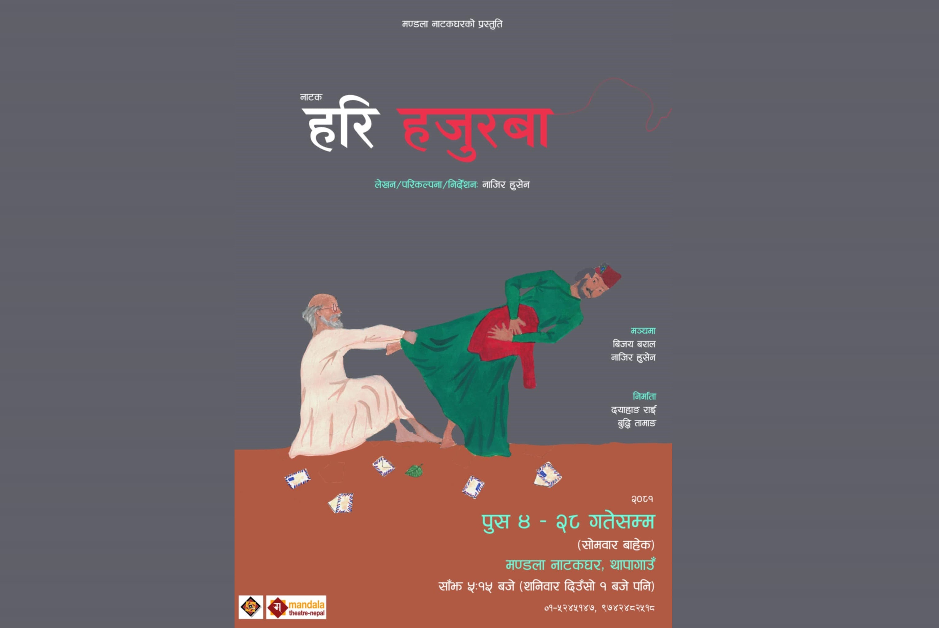 अभिनेताहरू दयाहाङ राई र बुद्धि तामाङ नाटकको निर्माता हुन्। चिठी पुर्याउँदै हिँड्ने हुलाकी केटो हरि र द्वन्द्वमा हराएकी नातिनीलाई पर्खिरहेका हजुरबाको मार्मिक कथामा नाटक मञ्चन हुन लागेको हो।