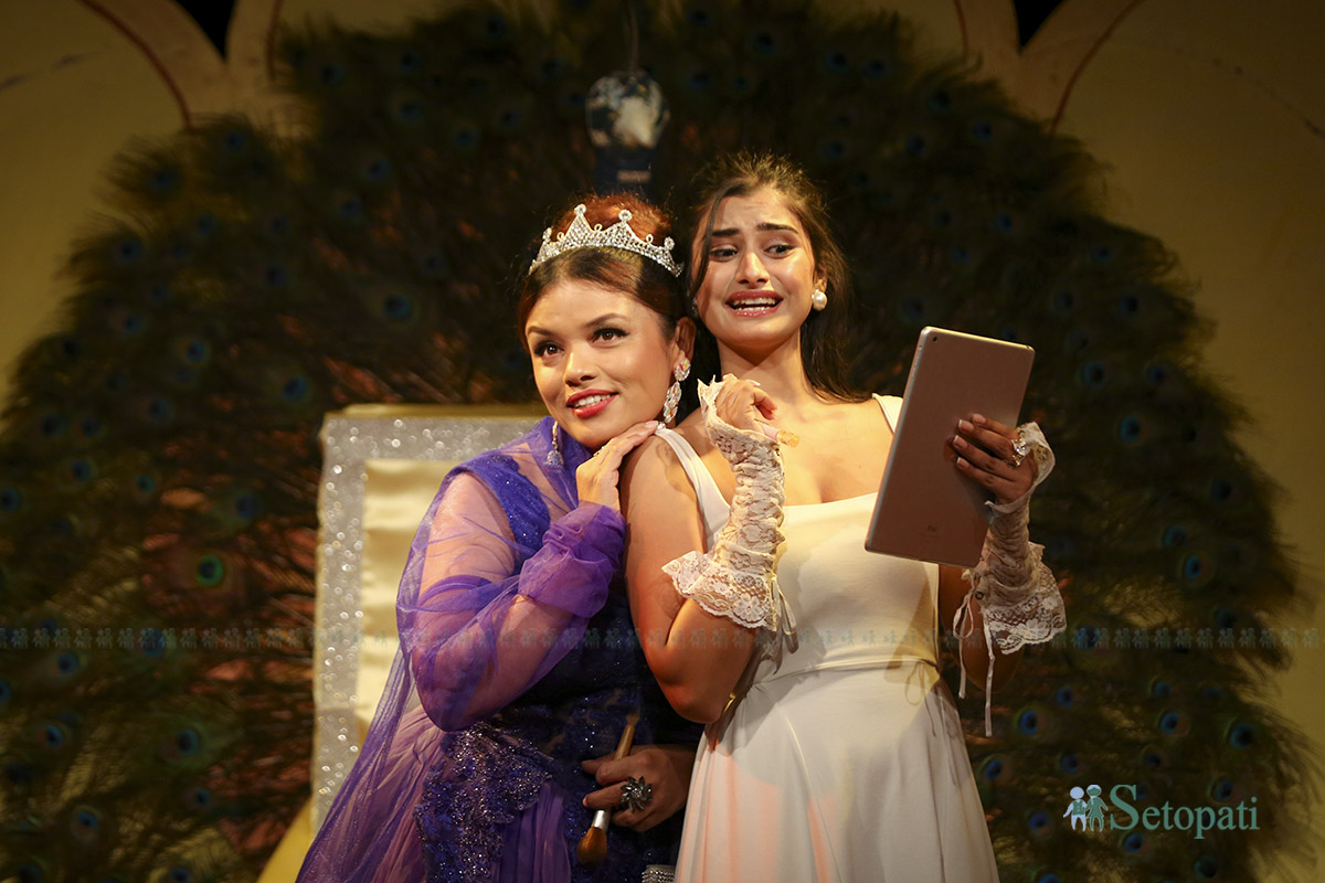 कान्तिपुर फिल्म एकेडेमीको नाटकघर, कान्तिपुर थिएटरमा नाटक 'महारानीको जात्रा' मञ्चन भइरहेको छ।