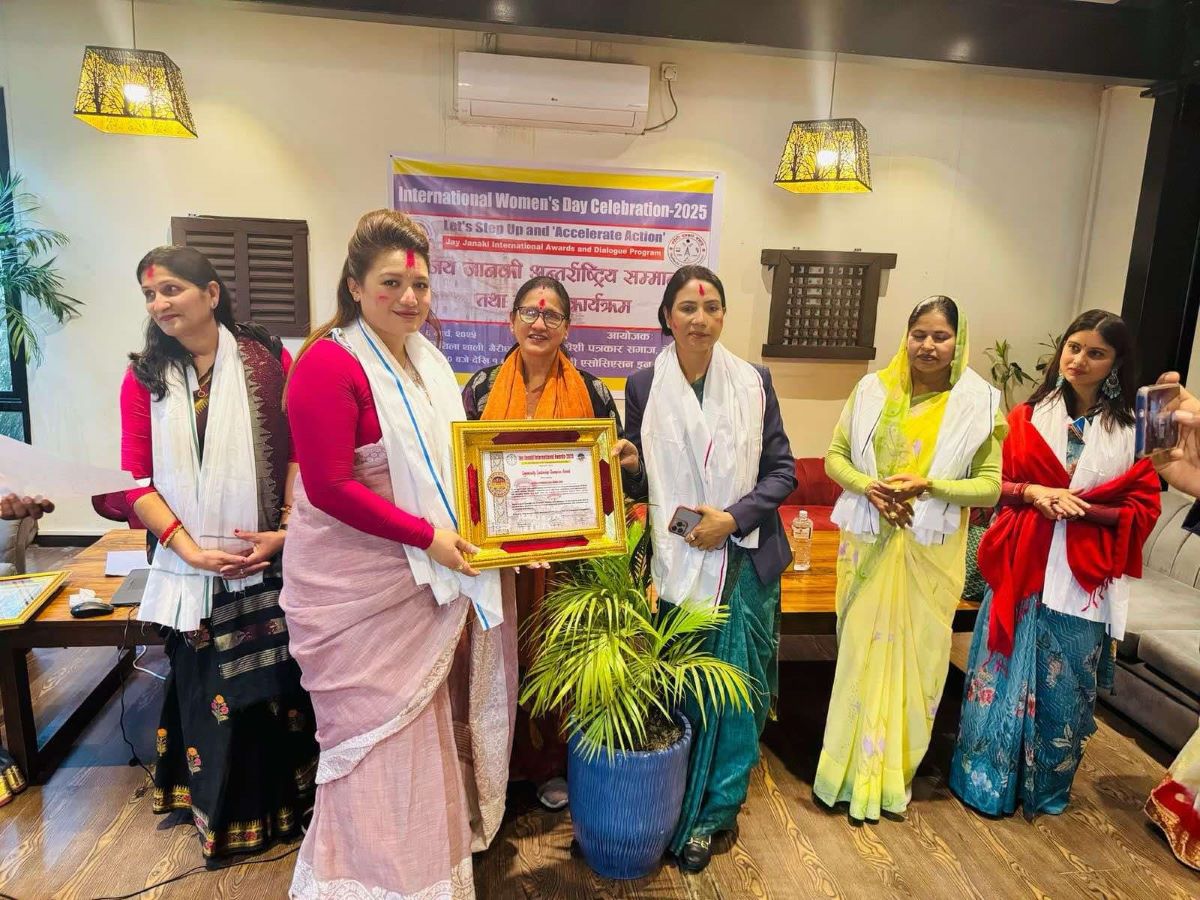 अन्तर्राष्ट्रिय महिला दिवस–२०२५ को अवसरमा काठमाडौंमा आयोजित एक कार्यक्रममा मधेसी पत्रकार समाजले एनआरएनए उपाध्यक्ष प्रधानलाई सम्मान गरेको हो।