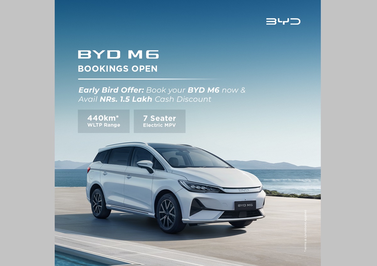 साइमेक्स इंक बिवाइडी अटो इन्डष्ट्री कम्पनीको नेपालका लागि आधिकारिक वितरकले नेपालकै पहिलो प्रिमियम ७ सिटर एमपिभी बिवाइडी एम६ को बुकिङ खुला गरेको छ।