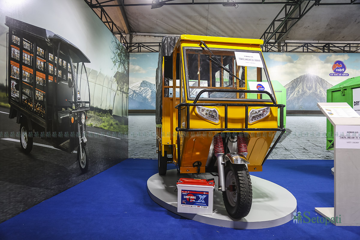 यो इ–रिक्सा काठमाडौंमा गुड्ने ट्याम्पोजस्तै देखिन्छ। तर यसको रङ पहेँलो हुन्छ।