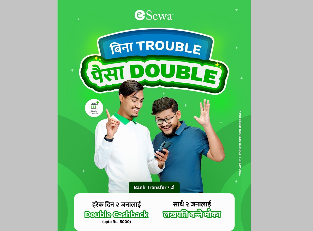 डिजिटल भुक्तानी सेवाप्रदायक कम्पनी इ–सेवाले 'बिना ट्रबल पैसा डबल' अफर सार्वजनिक गरेको छ।