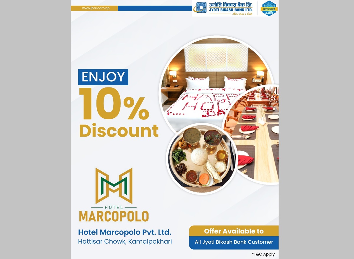 ज्योति विकास बैंक लिमिटेडले काठमाडौंको हात्तिसार स्थित 'होटल मार्कोपोलाे' मा बैंकका ग्राहकहरूलाई १० प्रतिशतसम्मको विशेष छुट प्रदान गर्ने सम्बन्धी सम्झौता गरेको छ।