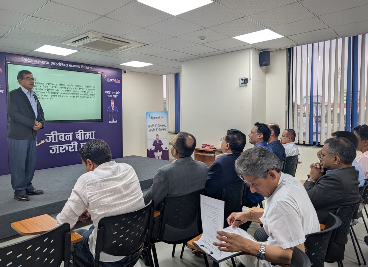 सिटिजन लाइफ इन्स्योरेन्स कम्पनीले सम्पत्ति शुद्धीकरण तथा आतंकवादी क्रियाकलापमा वित्तीय लगानी निवारण सम्बन्धी अभिमुखीकरण कार्यक्रम सञ्चालन गरेको छ।