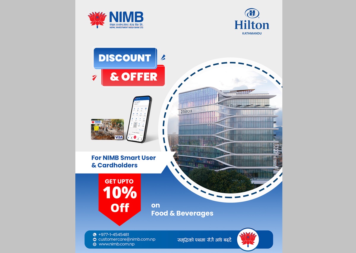 नेपाल इन्भेष्टमेण्ट मेगा बैंक (एनआइएमबी) लिमिटेड र हिल्टन होटलबीच भएको सम्झौतामा एनआइएमबीका ग्राहकहरूलाई फुड एण्ड बेवरेजमा १० प्रतिशतसम्म छुट दिने भएको छ।