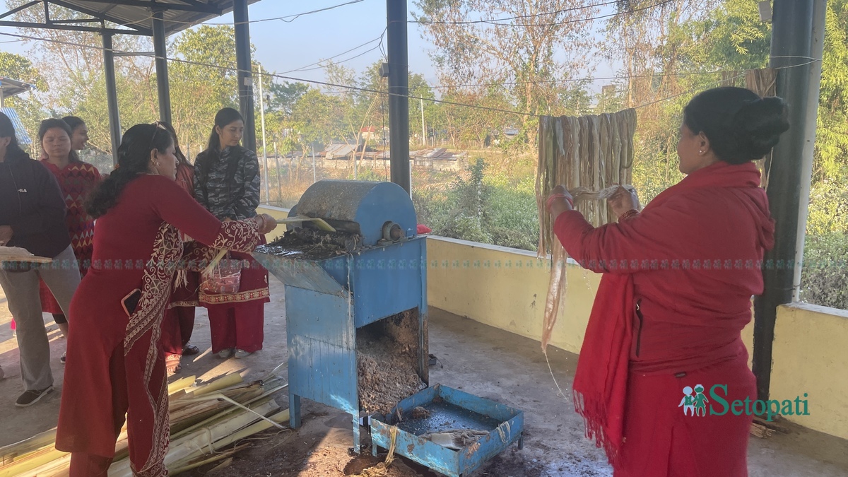 केही दिनअघि जुनी कुमाल रत्ननगर-९ टिकौलीमा केराको थम्बाबाट रेसा बनाइरहेकी भेटिइन्। यहाँ युएनडिपीले रत्ननगरका बासिन्दालाई केराको थम्बाबाट कपडा बनाउन मिल्ने रेसा (फाइबर) उत्पादन गर्न सिकाएको रहेछ।