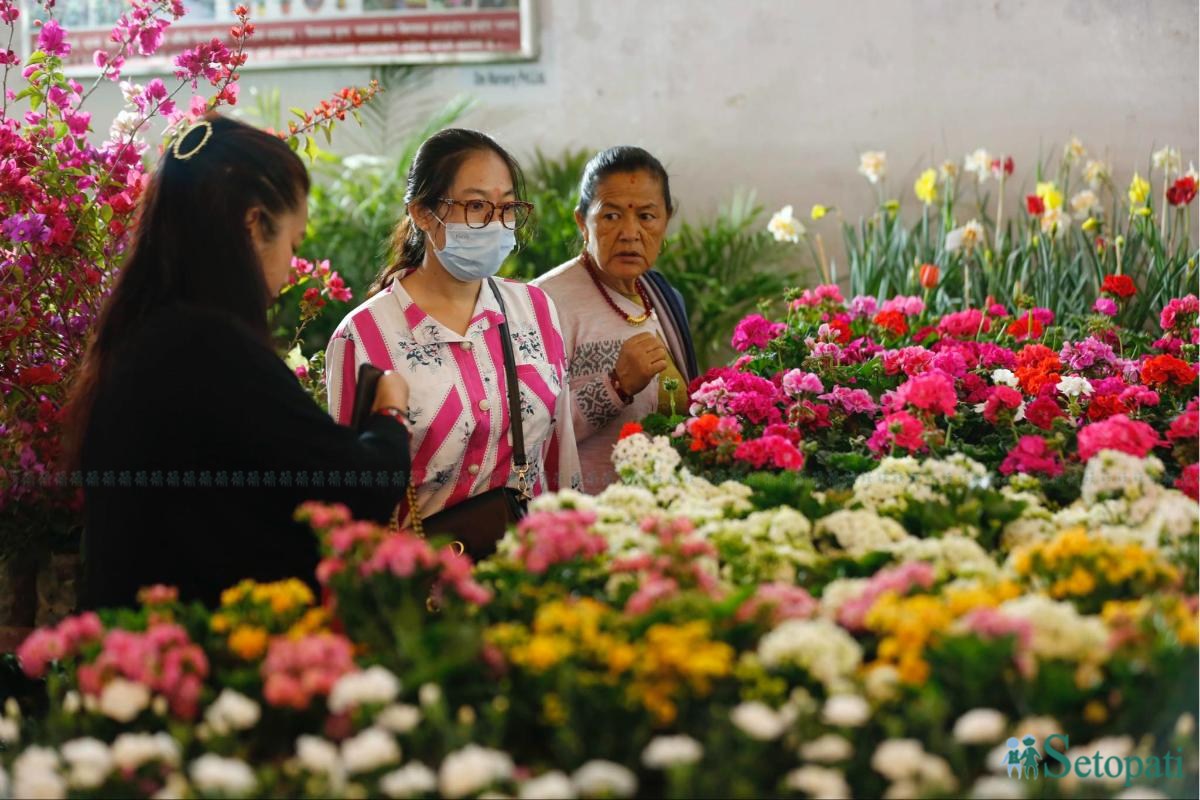 प्रदर्शनीमा फूलहरूको अवलोकन गर्नेहरुको भिड लाग्ने गर्छ।