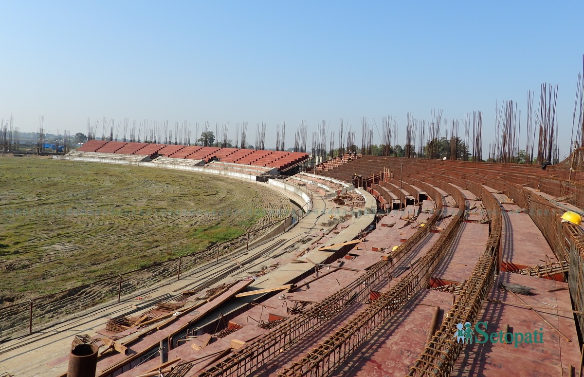 'बर्खाअघि मैदानका साथै प्यारापिट, भिआइपी टावरको बाहिरको काम सकिन्छ। बर्खाको समयमा भित्रको काम हुन्छ,' आचार्यले भने, 'सम्झौता अनुसारको म्याद अझै २२ महिना बाँकी छ। तर निर्माण कम्पनीको काम हेर्दा १५ महिनामै काम सकिने देखिन्छ।'