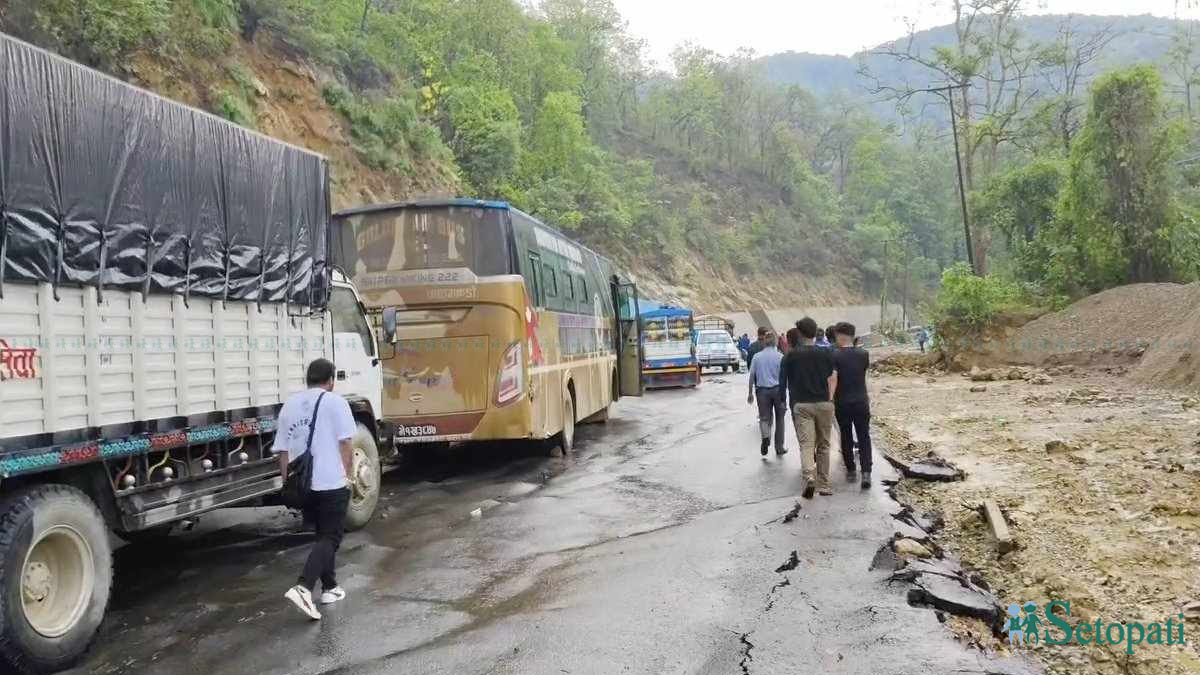 ‘सडकको डिल भत्किए पनि भित्तातर्फको एउटा लेन कालोपत्रे गरिएको र सोही क्षेत्रबाट सवारीसाधन आवतजावत गराइएको छ, भत्किएको सडकको डिललाई उठाएर दुईतर्फी गर्ने प्रयास जारी छ,' मिश्रले भने।