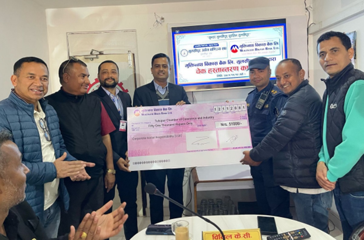 ‘बैंकले कमाउने मात्रै हैन, समाजका लागि केही योगदान पनि गर्नुपर्छ भन्ने वाणिज्य संघका अध्यक्षज्यूको प्रस्ताव तुलसीपुरका सबै बैंकका प्रतिनिधिहरू शतप्रतिशत सहमत छौं,’ उनले भने,‘मुक्तिनाथले हिजो नै वाणिज्य संघलाई एकाउन्न हजारको चेक हस्तान्तरण गरिसक्यो, अब छिट्टै सिद्धार्थ बैंक पनि सुरक्षित तुलसीपुर बनाउने त्यो अभियानमा जोडिने छ।’