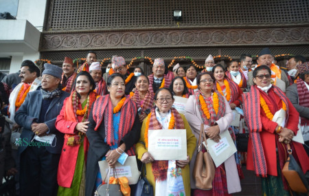 प्रमाणपत्र लिएपछि नवनिर्वाचित कांग्रेस सदस्यहरूको फोटो सेसन