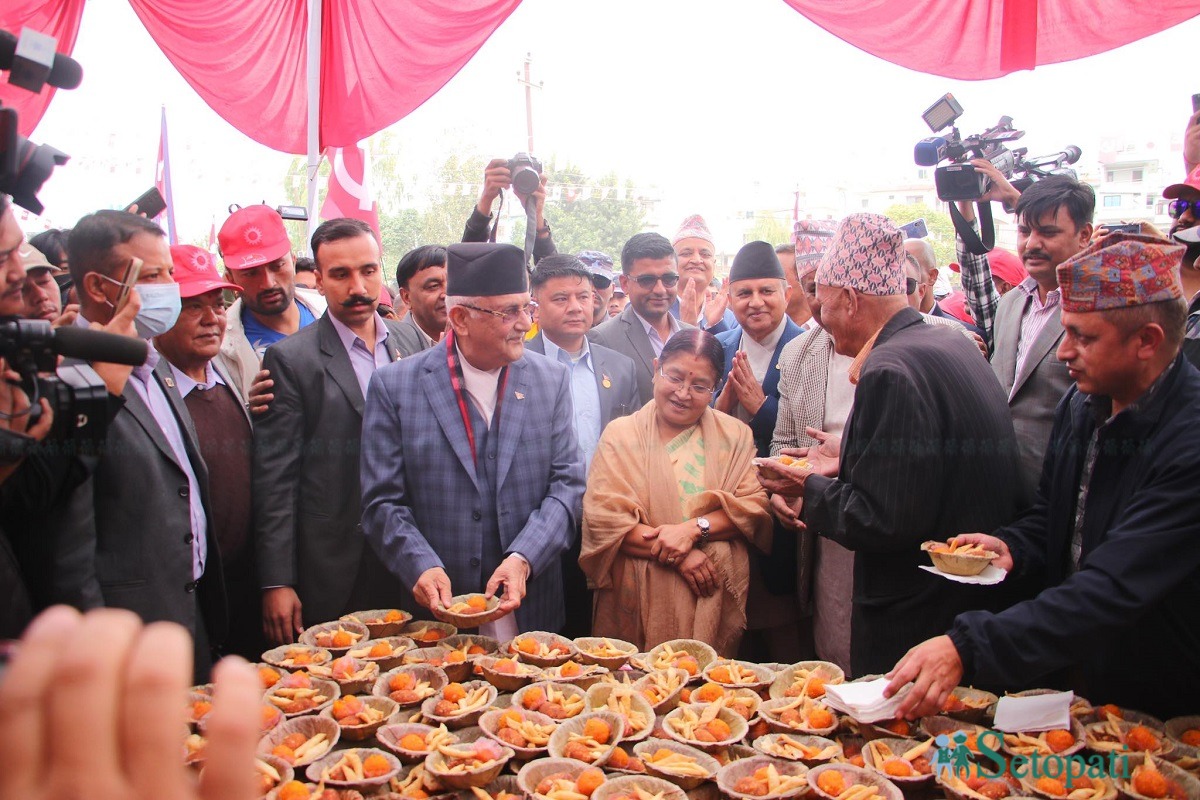 पार्टी कार्यालय च्यासलमा एमाले अध्यक्ष केपी शर्मा ओलीले शुभेच्छुकलाई परिकार दिएर चियापानको सुरूवात गरेका हुन्।