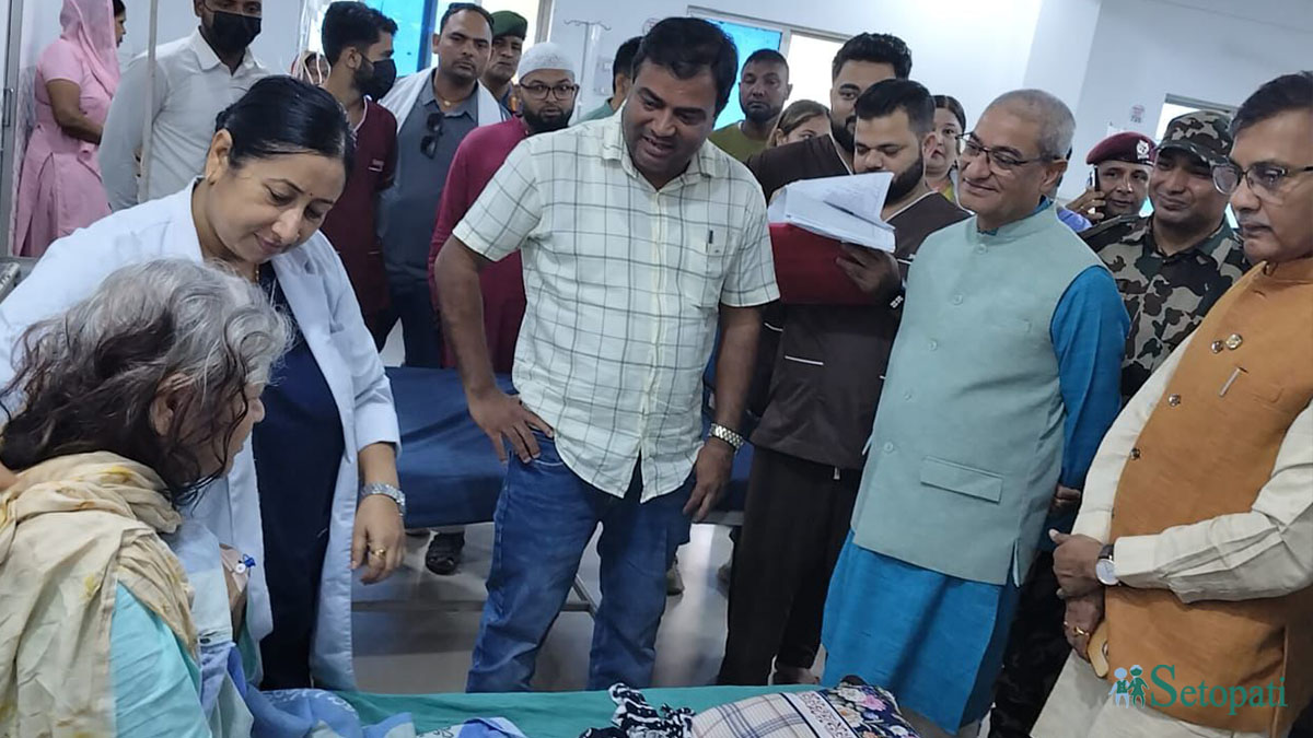 ‘आइतबार बिहान हाम्रो अस्पतालमा गृहमन्त्री र कानूनमन्त्री बिरामी भेट्न आउनुभएको थियो, हामीले जनरल वार्डमा उपचाररत बिरामीहरुसँग भेटायौं,’ उनले भने, ‘सुरक्षाकर्मीलाई समेत बाहिरै राखेर उहाँहरू भित्र छिर्नुभयो। स्वास्थ्यकर्मीहरू भने थियौं।’