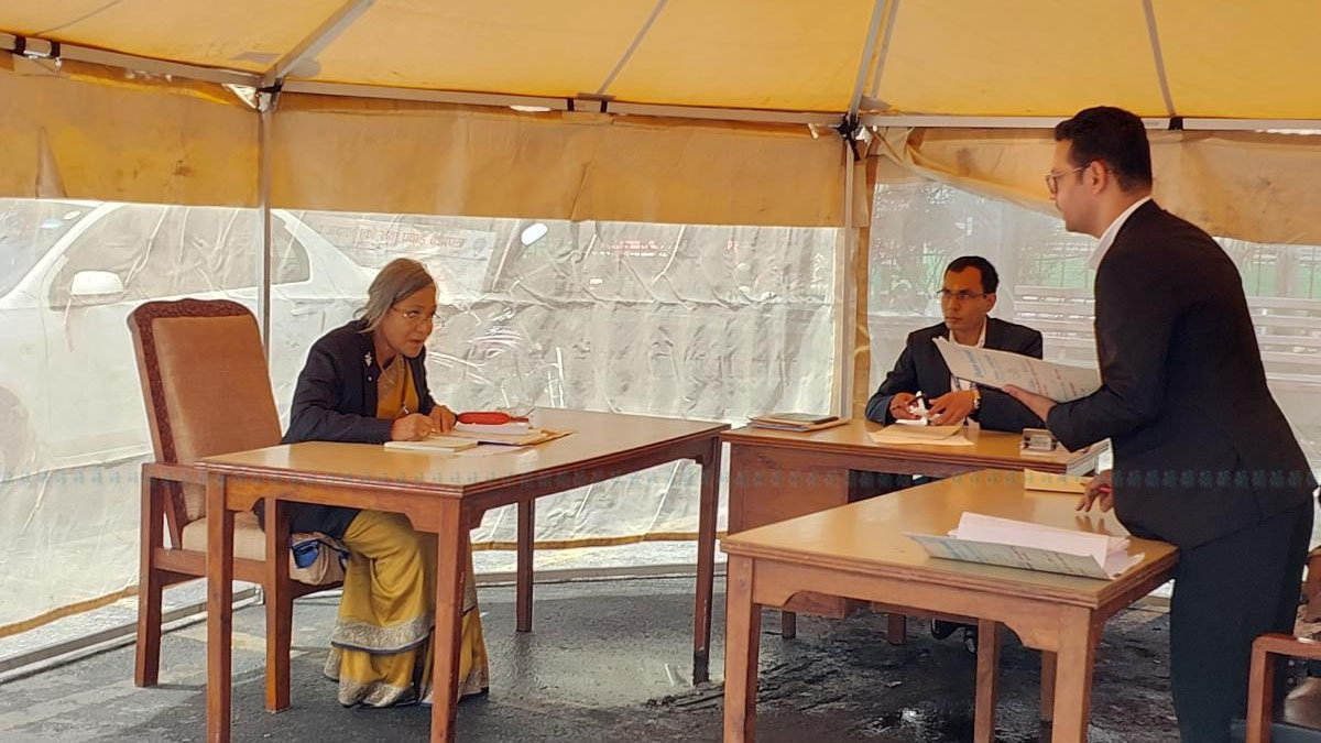 एउटा त्रिपालमुनि सर्वोच्चका कर्मचारीहरू बसे। उनीहरू सेवाग्राहीलाई सोधपुछ गर्न, रिट दर्ता गर्न र सहजीकरणका लागि बसेका हुन्।