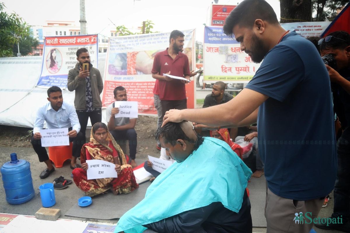 आरती साहको न्याय माग्दै धर्ना बसेका परिवारले माइतीघरमा मुण्डन गरे कपाल (तस्बिरहरू)