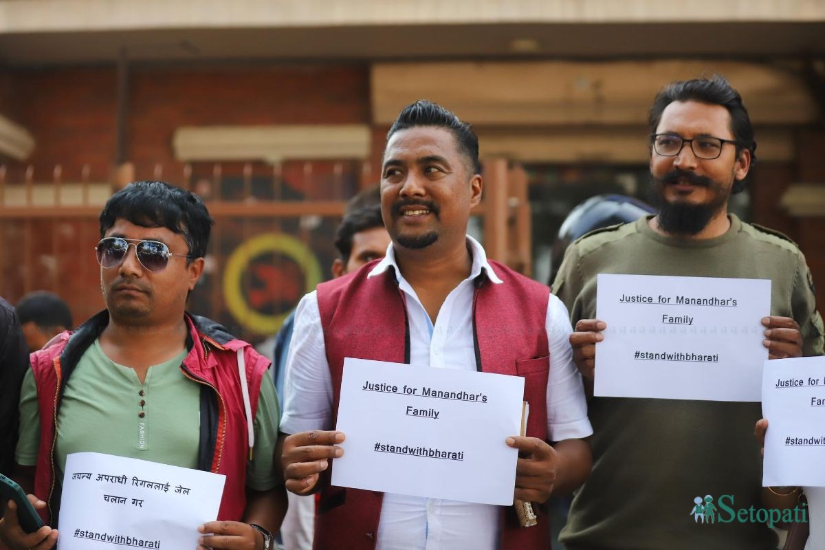 रिगलले हत्या गरेका चेतन मानन्धरकी श्रीमती भारती मानन्धर, अभियान्ता ईः र सुमन सायमी लगायतको उपस्थितिमा माइतीघरमा प्रदर्शन भएको हो। आन्दोलनमा एमालेनिकट युवासंघका कार्यकर्ताको पनि उपस्थिति थियो।