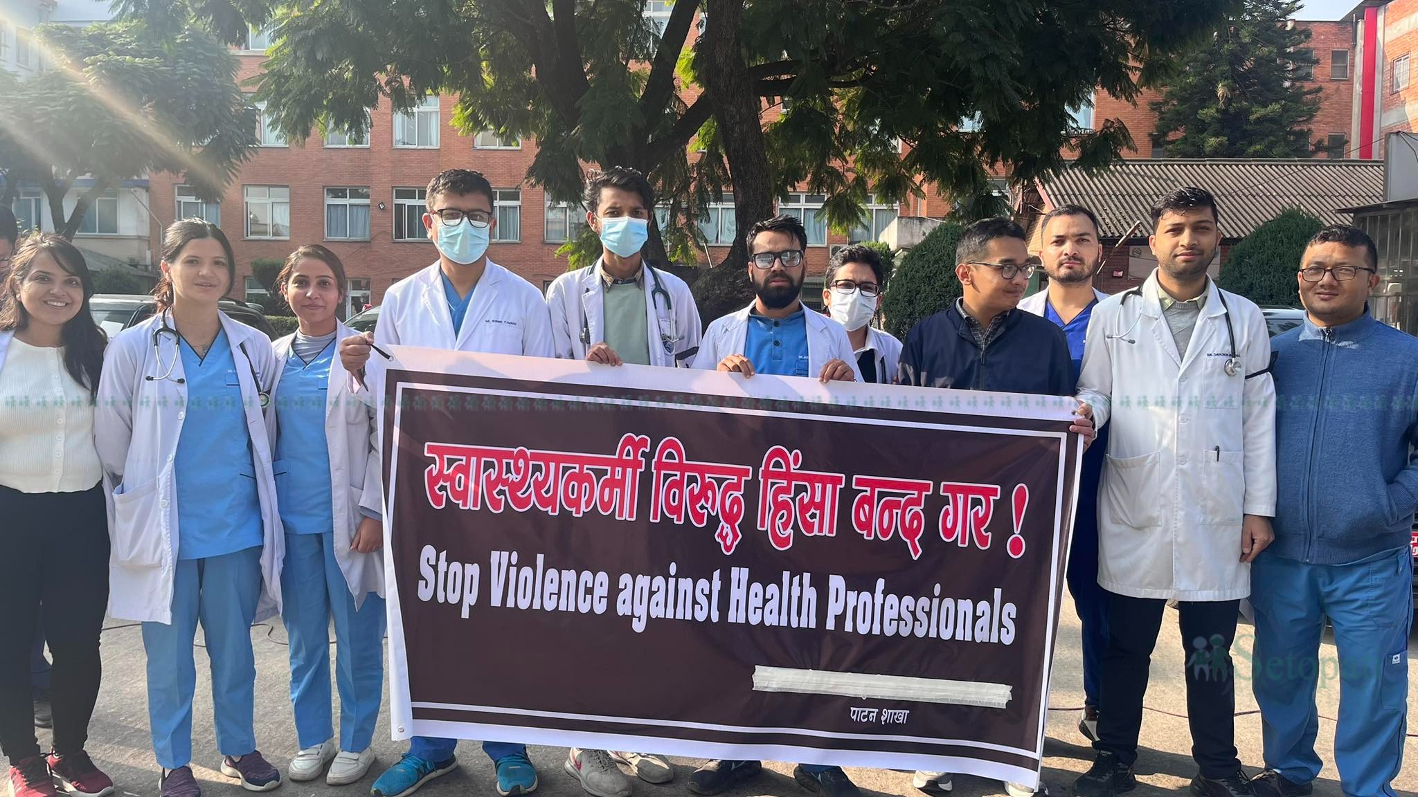 स्वास्थ्यकर्मीमाथि दुर्व्यवहार र कुटपिटका घटना नरोकिएको भन्दै उनीहरूले पाटन अस्पताल परिसरमा उभिएर विरोध जनाएका हुन्।