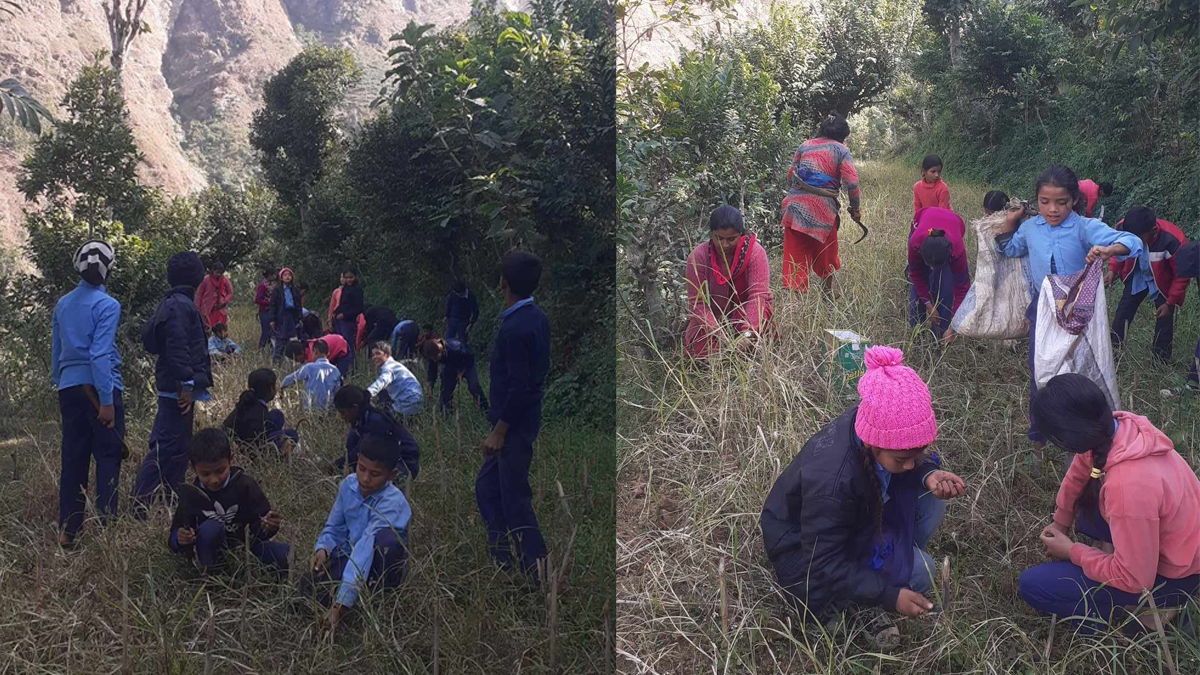 तीन जना शिक्षक हीरा जिसी, लक्ष्मी भण्डारी र रविना विक ४, ५ र ६ कक्षाका ३७ जना विद्यार्थी लिएर कोदो टिप्न गए।