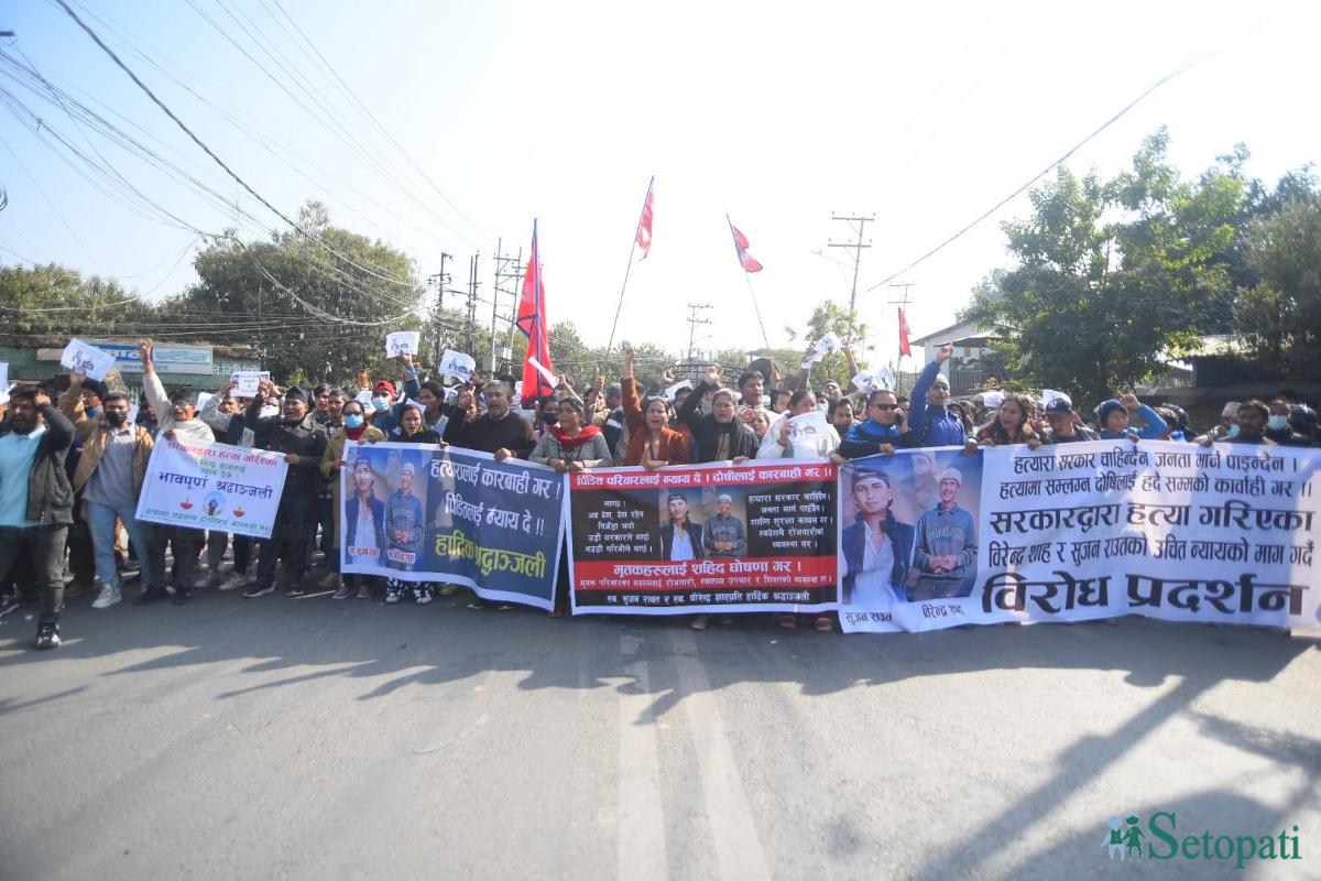 दुई जना युवकको मृत्यु हुनेगरी प्रहरीले गोली चलाएको विषयमा गृहमन्त्रीले राजीनामा दिनुपर्ने र दोषीलाई कडा सजाय हुनुपर्ने र मृतकलाई सहिद घोषणा गर्नुपर्ने लगायतका माग राख्दै मृतकका आफन्तलगायतले र्याली निकालेका हुन्।