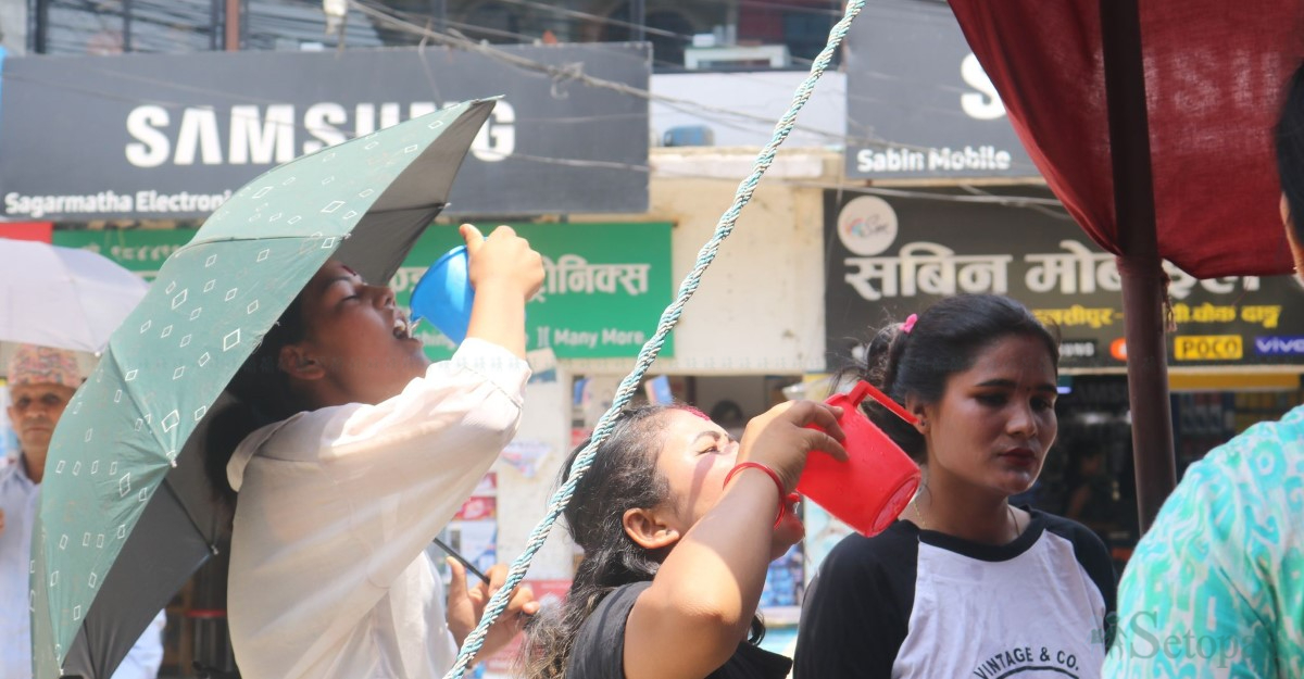 मानिसहरू गर्मीबाट जोगिन चिसो पिय पदार्थ पिइरहेका देखिन्छन्। रूख तथा छहारी भएको ठाउँमा मानिसहरू घामबाट जोगिन बसिरहेका छन्।