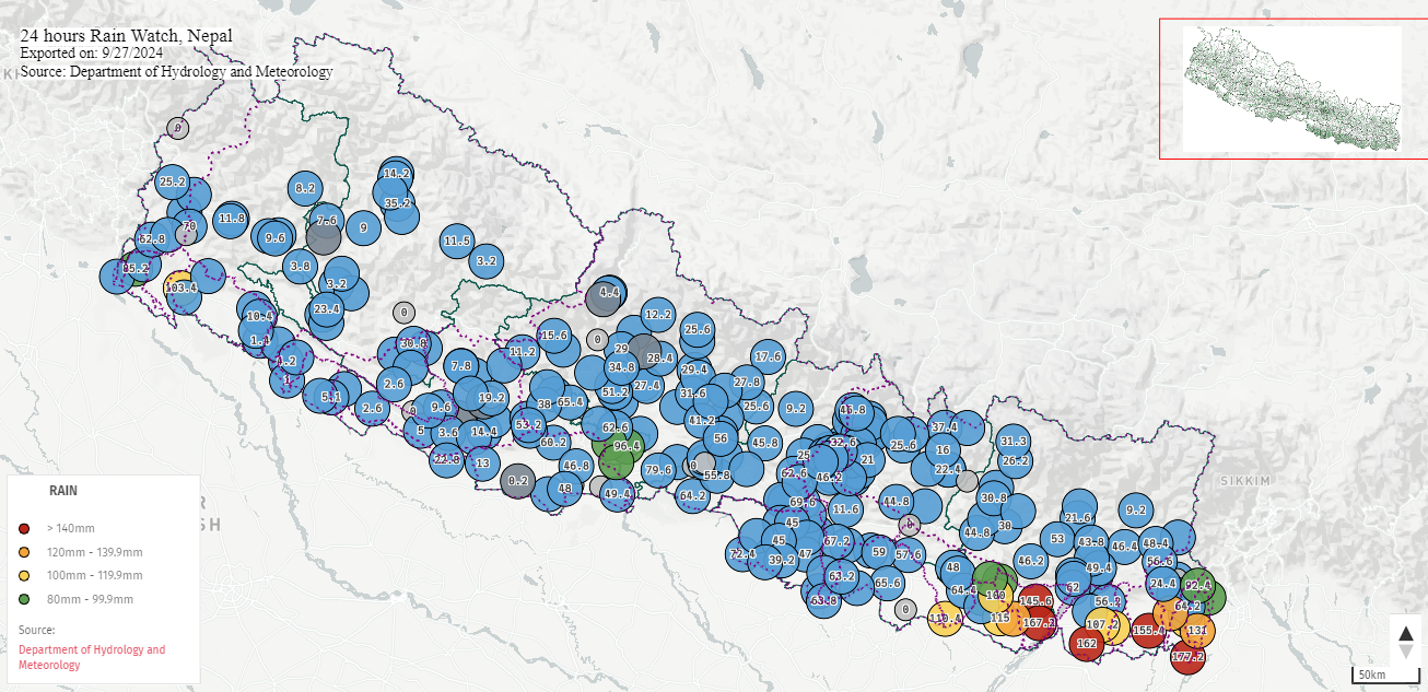 पछिल्लो २४ घन्टामा कोशी प्रदेशका केही स्थानभा भारी वर्षा भएको छ। मधेसका केही भूभागमा पनि भारी वर्षा भएको छ।