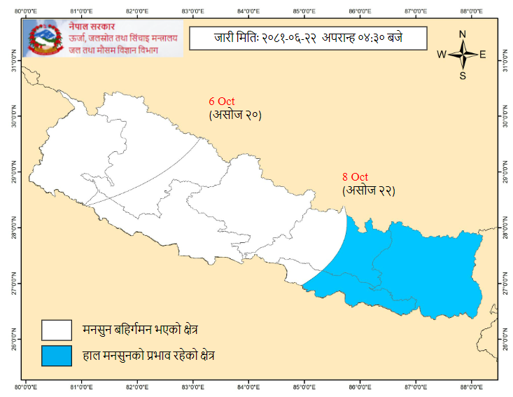 काठमाडौं उपत्यकासहित सुदूरपश्चिम, कर्णाली, लुम्बिनी र गण्डकी प्रदेशका सम्पूर्ण भूभागबाट यसपालिको मनसुन बाहिरिएको छ।