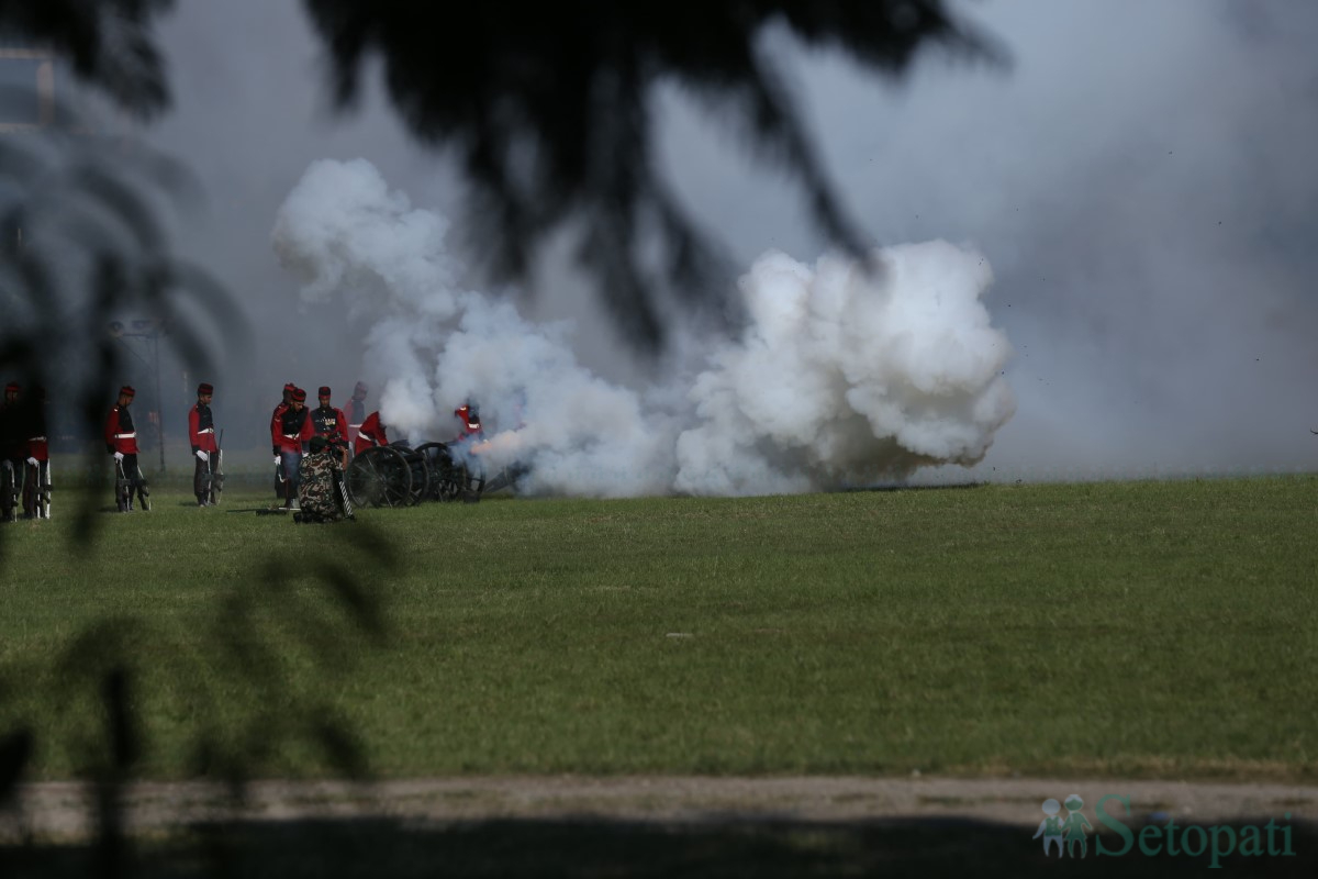 हनुमानढोका दरबार स्क्वायरमा गोरखाबाट ल्याइएको फूलपाती भित्र्याउने क्रममा नेपाली सेनाद्वारा २१ तोपको बढाइँ गर्ने चलन रहेको छ।