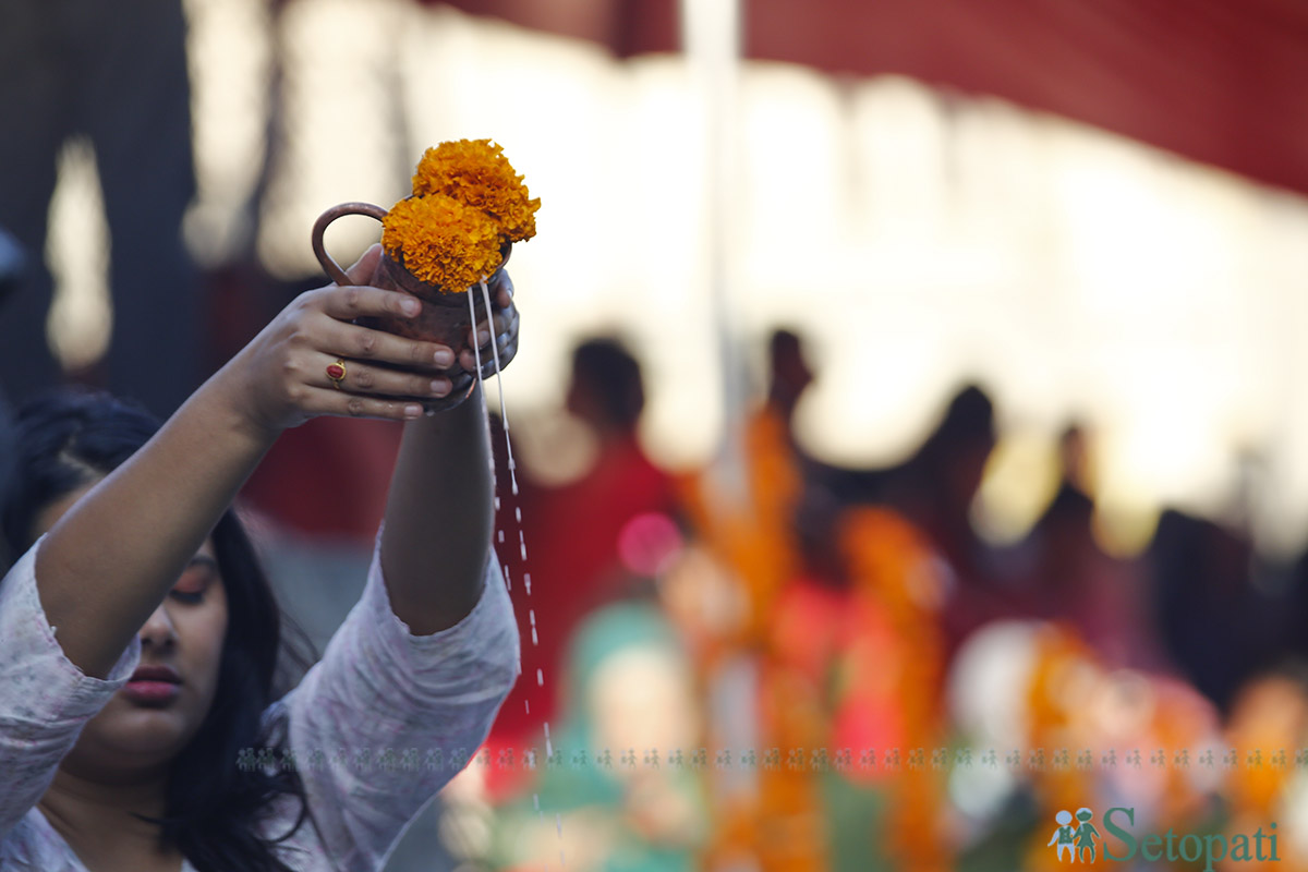 पारिवारिक सुख, शान्ति, समृद्धि, रोगबाट मुक्ति तथा मनोकांक्षा पूरा होस् भन्ने उद्देश्यले श्रद्धापूर्वक मनाइने छठका अवसरमा पोखरी, नदी, तलाउमा श्रद्धालु भक्तजनको भीड लागेको थियो। व्रतालुले अस्ताउँदो सूर्यलाई अर्घ्य दिएर सूर्योपासनाको यो पर्वको प्रारम्भ गरेका थिए।
