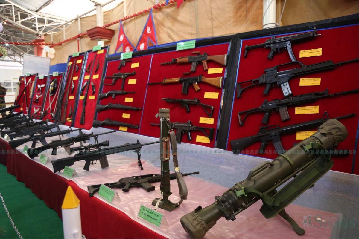 मंगलबार जंगी अड्डामा खुकुरी, तरबारसहित पुराना एवं आधुनिक हातहतियार, बम डिस्पोज गर्ने सामग्रीको प्रदर्शनी गरेको हो।