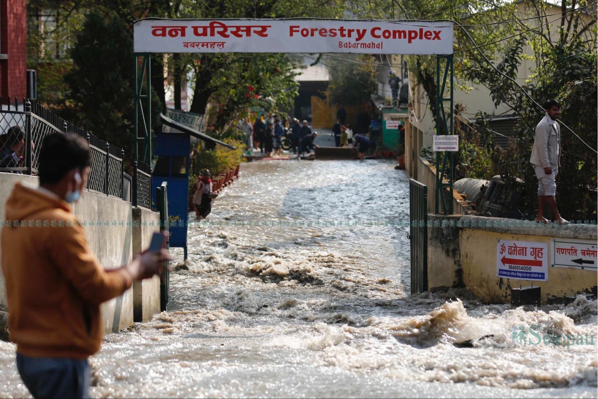 बुधबार दिउँसो साढे दुई बजेतिर मेलम्ची खानेपानीको पाइप फुटेको हो। पाइप फुटेपछि वन परिसरभित्र पानी पसेको छ। त्यहीँ छेउमा जिल्ला अदालत काठमाडौं र विशेष अदालत पनि छ। त्यहाँ पनि पानी पसेको छ।