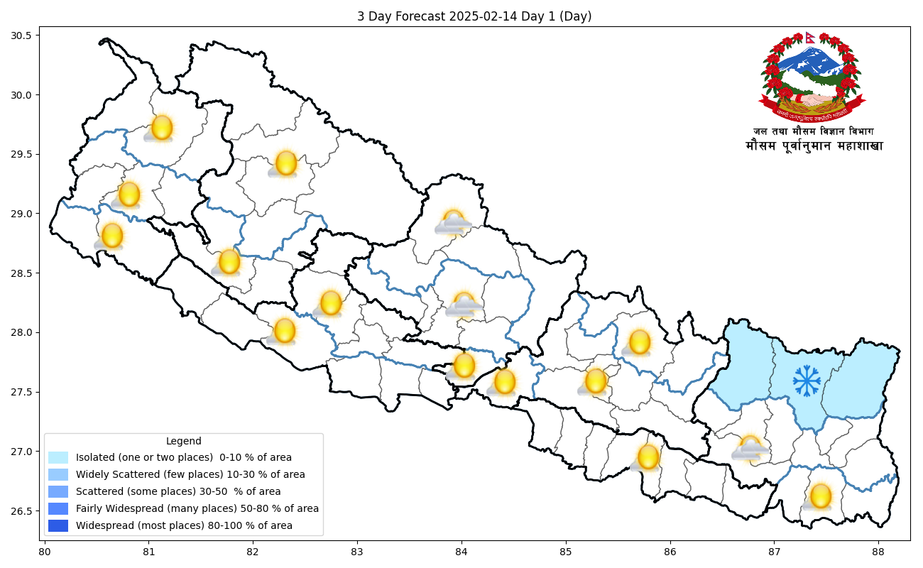 अहिले बिहान कोशी र गण्डकी प्रदेशका पहाडी भू–भागमा आंशिक बदली रही बाँकी भू–भागमा मौसम मुख्यतया सफा रहेको छ।