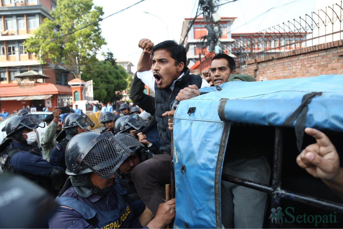 ऊर्जामन्त्रीको विरोध गर्दै सिंहदरबार गेटमा प्रदर्शन गर्ने पक्राउ (तस्बिरहरू)