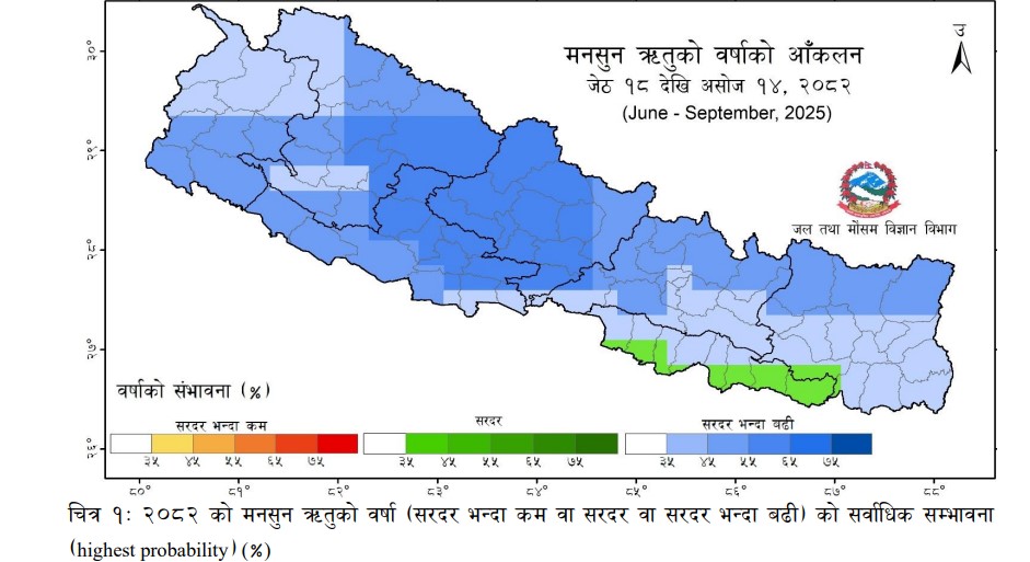 विभागका अनुसार यस मनसुन ऋतुमा देशका अधिकांश स्थानमा सरदरभन्दा बढी वर्षा हुने सम्भावना रहेको छ।