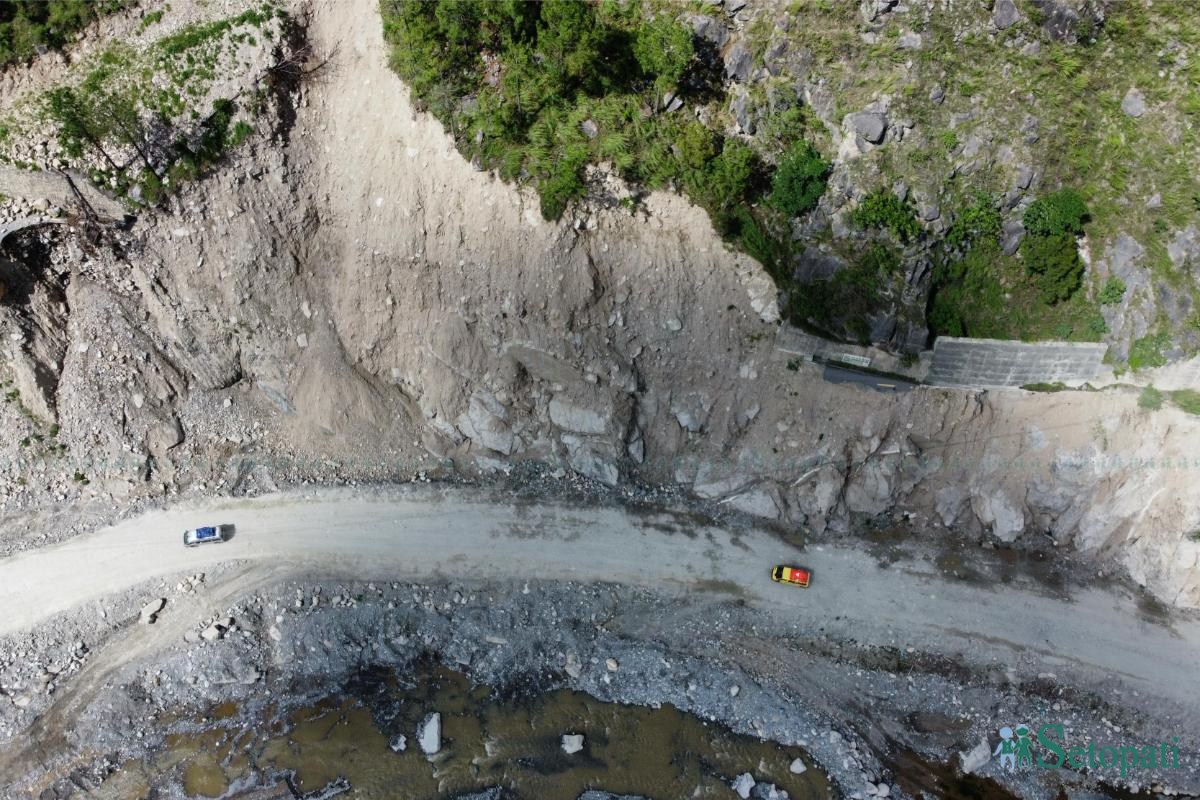 अहिले डाइभर्सन गरी अस्थायी बाटो बनाएर सवारीसाधन चलाइएको छ तर ढुक्कले यात्रा गर्न सक्ने अवस्था छैन।