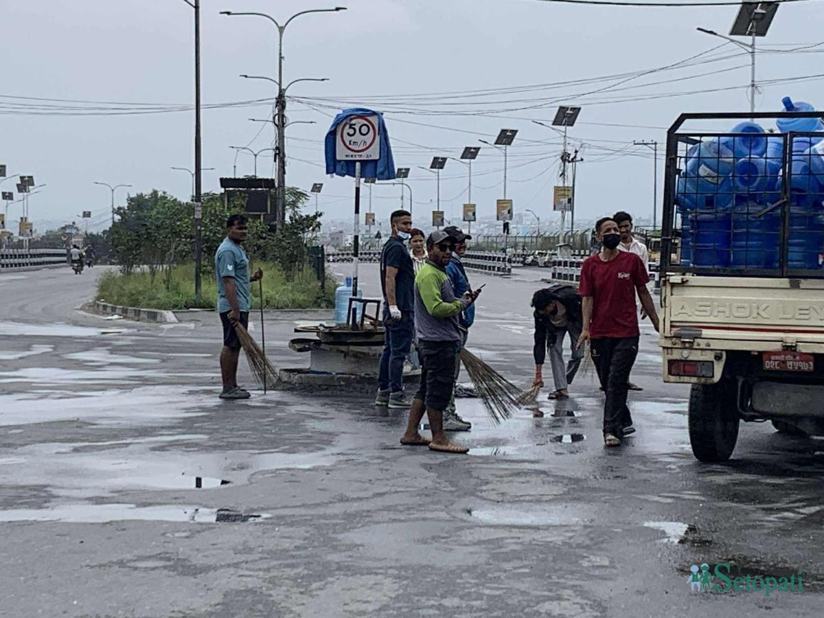 बानेश्वर क्षेत्रका सडकमा युवाहरूले सरसफाइ गरेका छन्।
