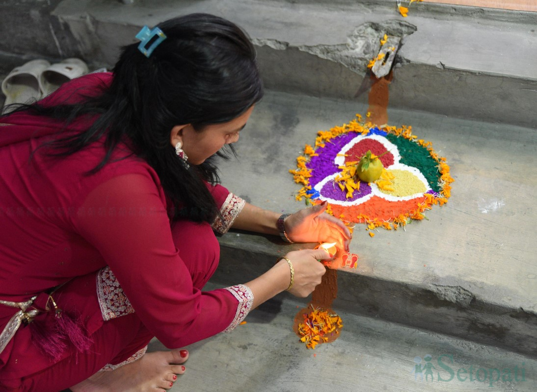 घर घरको ढोकामा रातो माटो लिपेर लक्ष्मीको पाइला र रङ्गोली बनाउँदै लक्ष्मीपूजा मनाइएको छ।