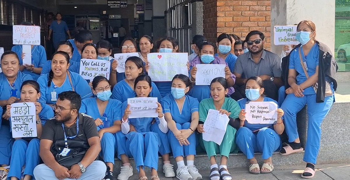 मेडिकल कलेजमा कार्यरत नर्सिङ कर्मचारीहरूले आफ्नो काम जारी राख्दै मेडिकल कलेज परिसरमा प्लेकार्डसहित धर्ना र नाराबाजी गर्दै प्रदर्शन गर्दै आएका छन्।