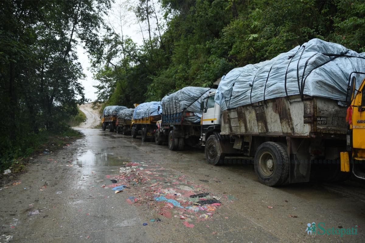 फोहोर बिसर्जन गर्न अवरोध भएपछि काठमाडौंबाट फोहोर लिएर गएका ट्रकहरू बाटैमा रोकिएका छन्।
