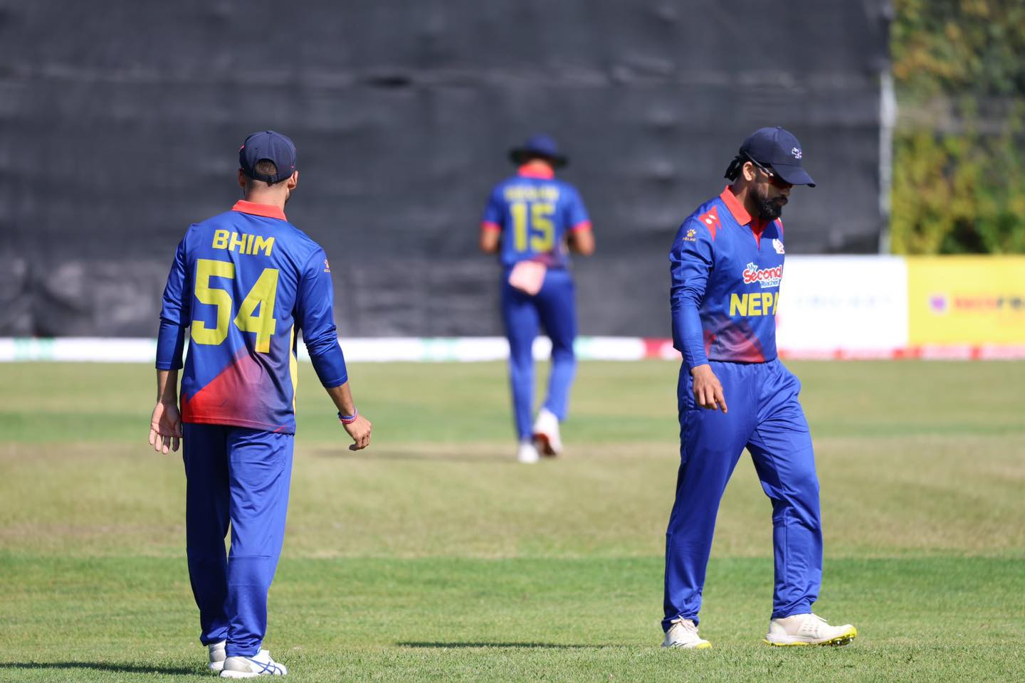 सुरुवाती तीन ब्याटर सस्तैमा आउट भएपनि दबाब बढ्दा भीम सार्कीले पनि इनिङ अघि बढाउन सकेनन्। उनी ३० बल खेल्दा १८ रनमा बनाएर आउट भए। भीम आउट भए पछि नेपालले कुशल मल्ल, दीपेन्द्रसिंह ऐरी र सोमपाल कामीबाट आशा गरेको थियो। तर तीनै जनाले खराब ब्याटिङ गरे। कुशल मल्लले ४१ बल खेल्दा केवल १२ रन जोडे भने कुनै चौका र छक्का प्रहार गर्न सकेनन्। दीपेन्द्रसिंह ऐरी पनि १० बलमा ८ रन बनाएर आउट भए। सोमपाल कामीले २५ बल खेल्दा ६ रन मात्र जोड्न सकेन।