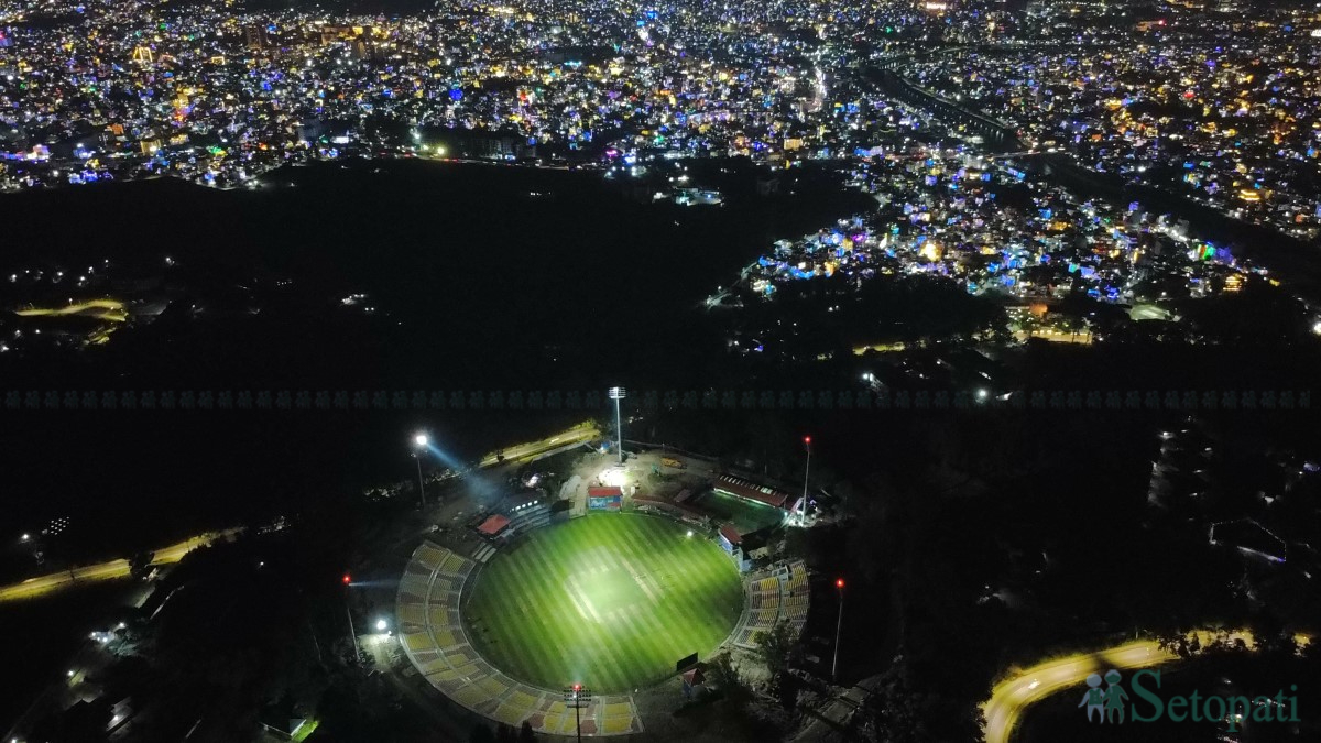 रंगशालामा जडान गरिएका चारवटा हाइ मास्ट पोल बत्ती बालिएपछि सम्पूर्ण मैदान उज्यालिएको थियो।