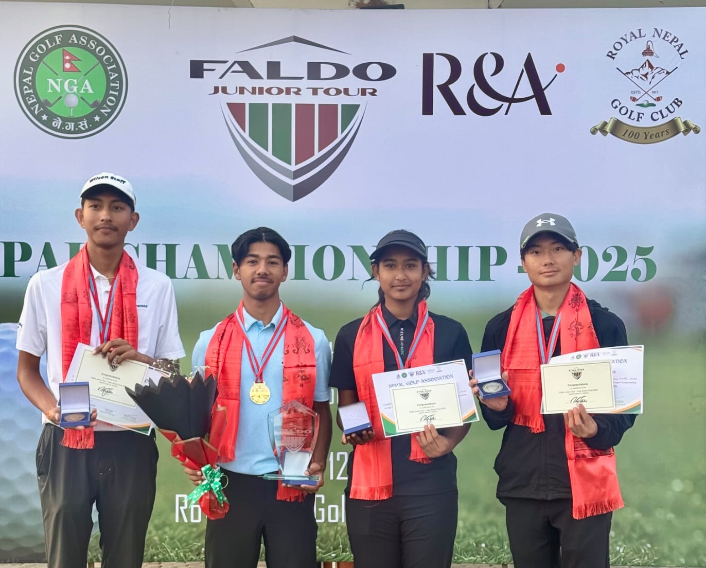 फाल्डो जुनियर टुर नेपाल च्याम्पियनसिपको समग्र र पुरुष १७-२१ वर्ष उमेर समूहको उपाधि नेपाल नम्बर एक एमेच्योर गल्फर सदभाव आचार्यले जितेका छन्।